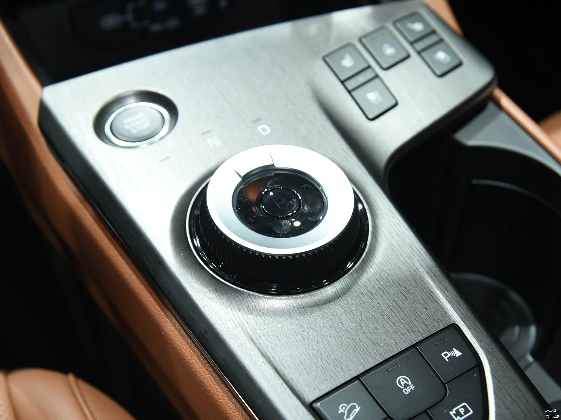 新款的档杆区域采用了非对称的设计,面板改为哑光质感,避免了指纹和划痕。增加了一些科幻感,同时自动驻车、泊车、陡坡缓降、手刹等按键的面积也变小了,集中在了档杆后方。