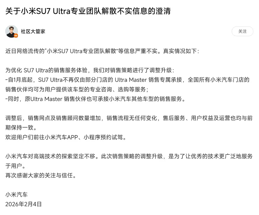 随即小米汽车官方对此进行了回应,表示此次调整是对SU7 Ultra销售策略的升级,从1月底开始,SU7 Ultra不再仅由部分门店的Ultra Master销售专属承接,全国所有小米汽车门店的销售均可为用户提供该车型的专业咨询、选购等服务;同时,原Ultra Master销售伙伴也可承接小米汽车其他车型的销售服务。