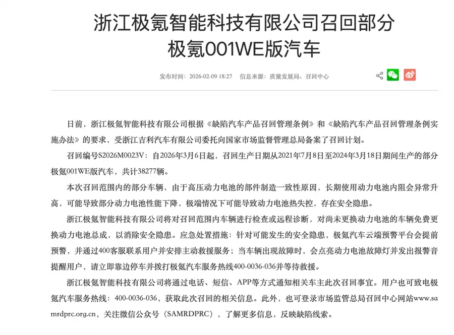 召回车型:2021年7月8日-2024年3月18日生产的极氪001WE86版(共计38277辆);