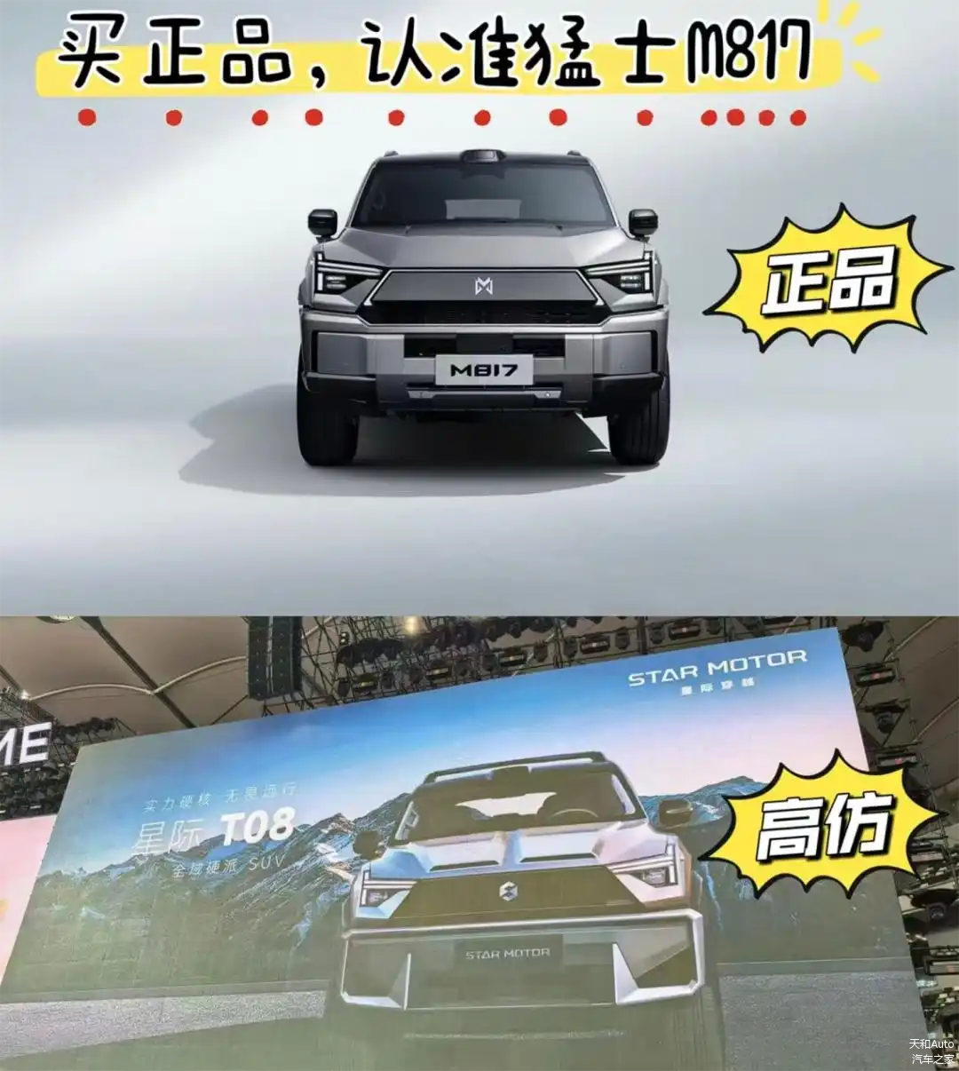 有风格近似布加迪威龙的,有看起来很像劳斯莱斯库里南的;有硬派SUV产品看起来很像东风猛士M817、917的,结果还被猛士汽车的高管直接贴出图片对比,将其产品图片打上了“高仿”的字样。