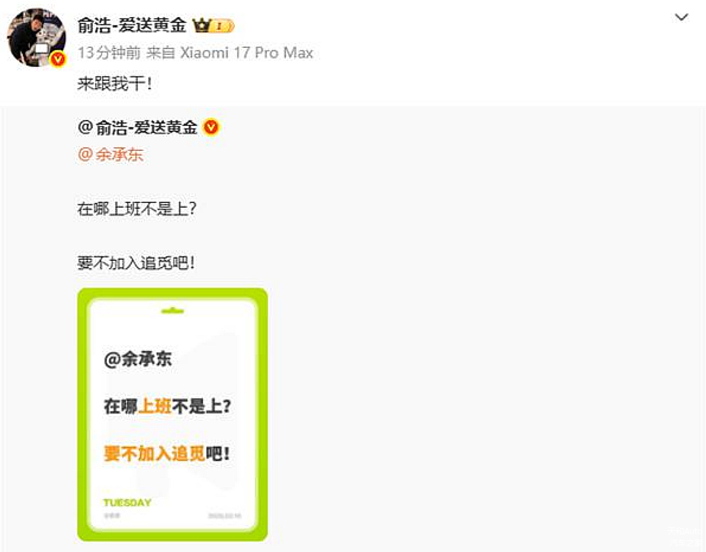 毫无疑问,余承东怕是不会搭理俞浩,对这样的一家新兴公司而言,跳槽的可能性应当是无限接近零。相信俞浩也不见得想不到这样的结果,所以这一次看似的“隔空邀请”应当不过是一次话题的制造,是在借助余承东和华为的热度与流量。