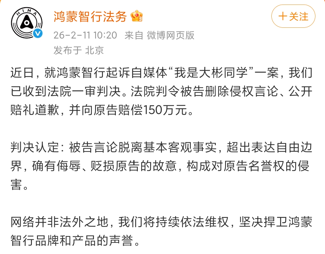 据鸿蒙智行法务发布,就鸿蒙智行起诉自媒体“我是大彬同学”一案,已经收到法院判决。鸿蒙智行法务透露,“法院判令被告删除侵权言论、公开赔礼道歉,并向原告赔偿150万元。判决认定:被告言论脱离基本客观事实,超出表达自由边界,确有侮辱、贬损原告的故意,构成对原告名誉权的侵害。”