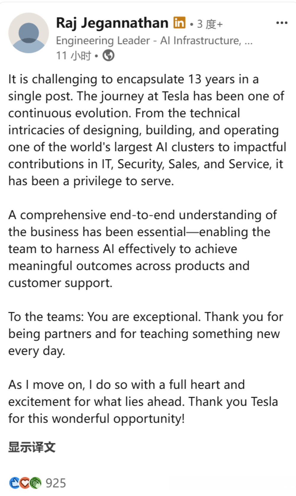 Raj Jegannathan的离职,意味着特斯拉失去了一位同时精通AI技术与销售管理的核心高管。