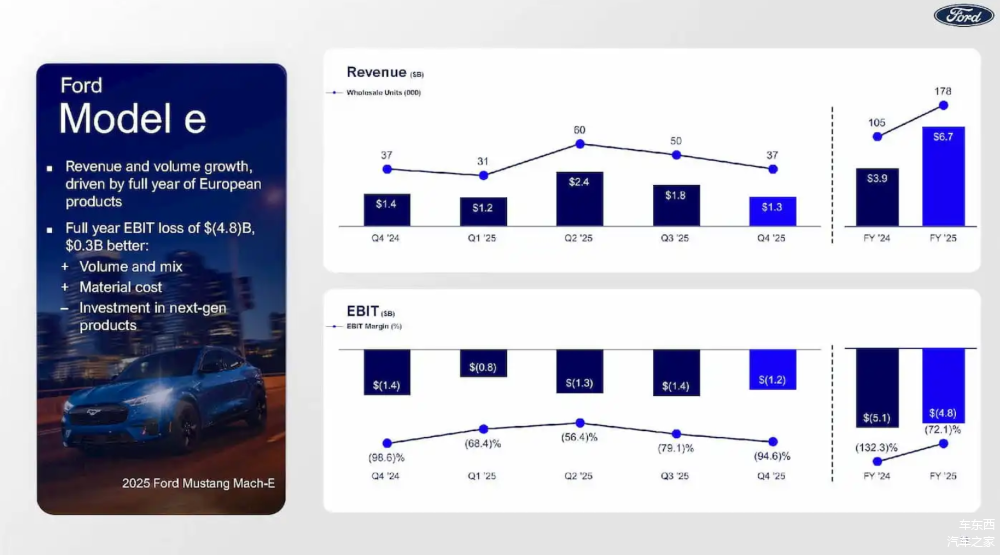 另一方面,电动车业务持续面临经营亏损。财报显示,电动汽车部门目前尚未实现盈利。仅在第四季度,该部门亏损12亿美元(约合83.3亿元人民币);2025全年,福特电动车业务累计运营亏损达48亿美元(约合333.3亿元人民币)。