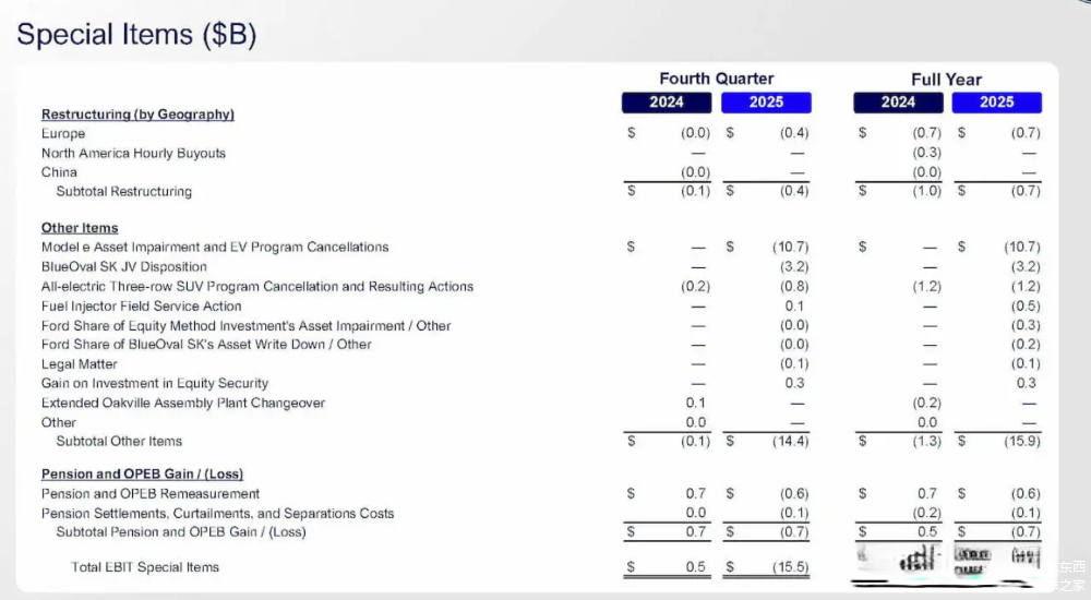 首先,公司电动汽车业务大幅减值是造成亏损的主要原因。因重组电动车业务、削减早期产品线及调整开发计划,福特在2025年第四季度确认了144亿美元(约合1000.3亿元人民币)的特殊费用。这是公司为调整过去过于激进的电动车发展计划而付出的代价。