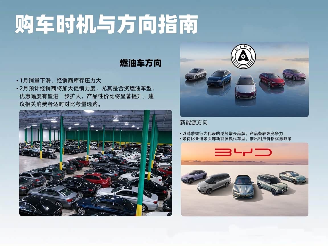 对于计划购置燃油车的消费者而言,当前或为较为合适的购车时机。1月销量下滑导致经销商库存压力加大,预计2月经销商将加大促销力度,尤其是合资燃油车型,优惠幅度有望进一步扩大,产品性价比将显著提升,建议相关消费者适时对比考量选购。