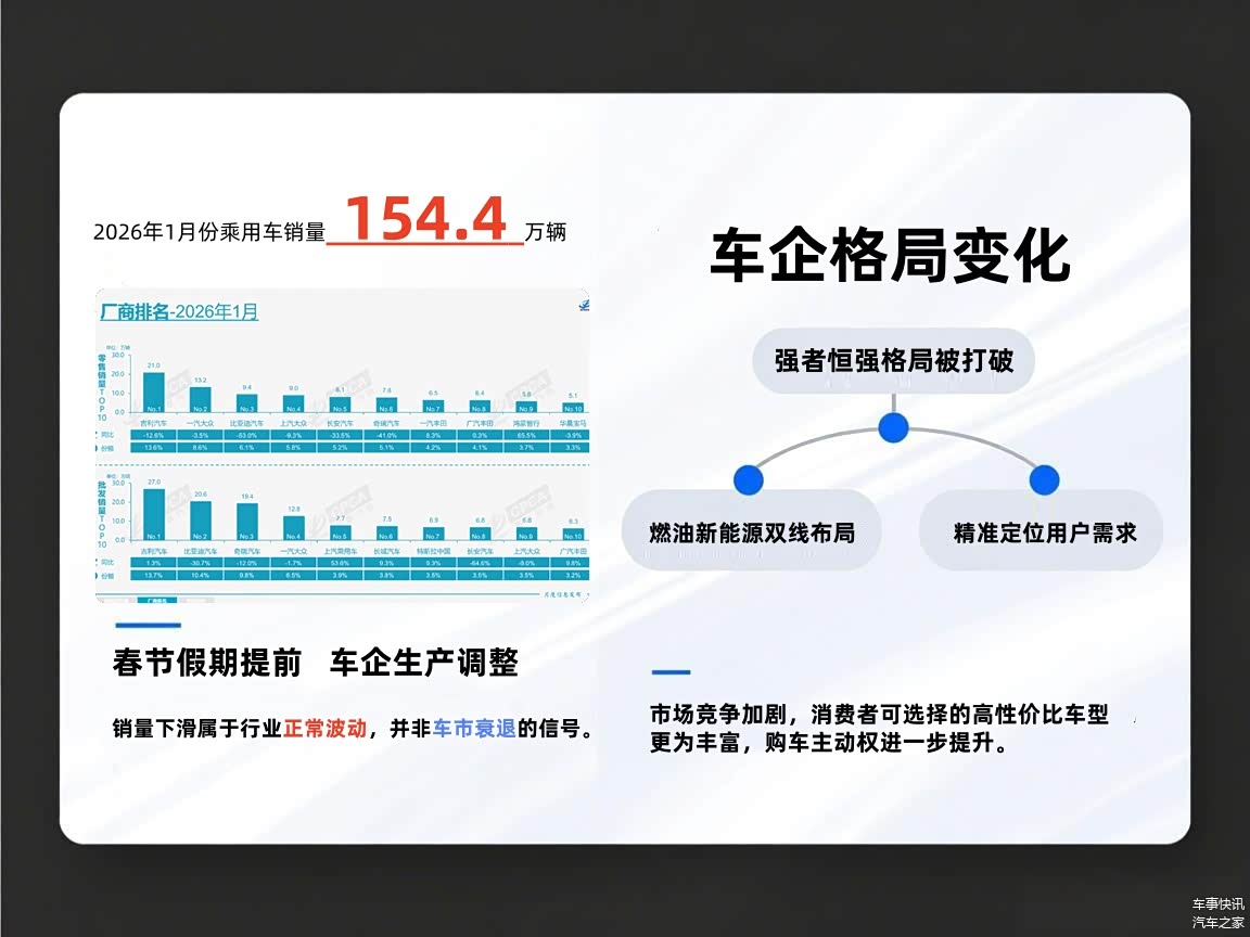 综上所述,1月154.4万辆的乘用车零售数据,主要受春节假期提前、车企生产调整等短期因素影响,属于行业正常波动,并非车市衰退的信号。从车企表现来看,“强者恒强”的传统格局正在被打破,能够实现燃油与新能源双线布局、精准定位用户需求的车企,更能在市场分化中站稳脚跟。对于消费者而言,市场竞争加剧意味着可选择的高性价比车型更为丰富,购车主动权进一步提升。