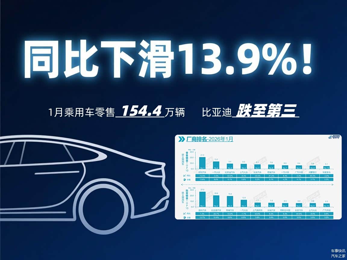 从整体数据来看,154.4万辆的零售成绩虽符合开年车市的常规运行节奏,但同比13.9%、环比近三成的下滑幅度,仍直观反映出开年车市的承压态势。更为关键的是,细分市场与车企表现呈现明显分化,这种格局变动值得行业及消费者重点关注。