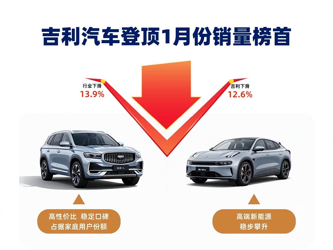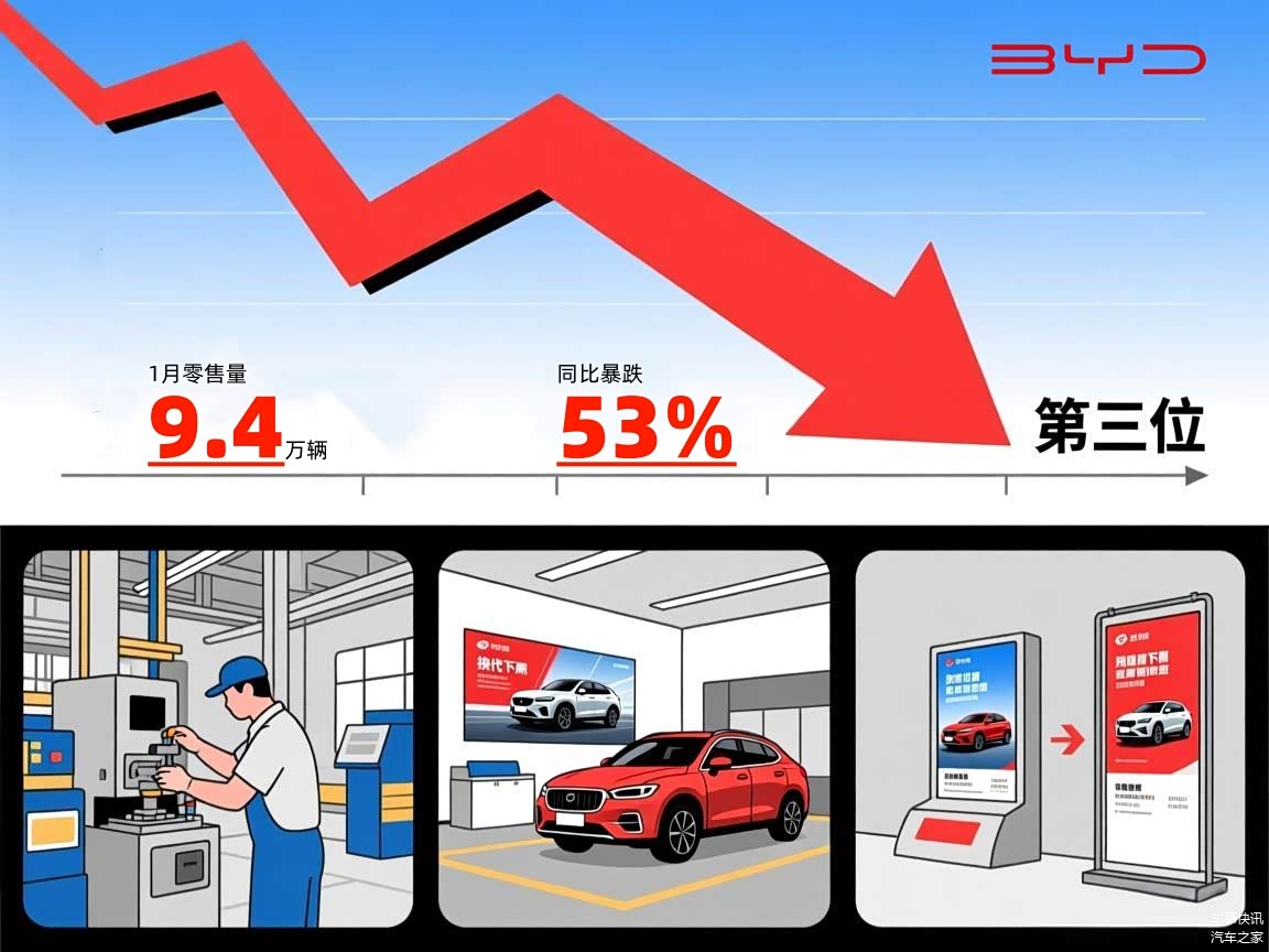比亚迪的表现较为意外,1月零售量仅9.4万辆,同比暴跌53%,从常年销量榜首滑落至第三位,跌幅显著高于行业平均水平。需明确的是,其销量下滑并非源于产品力不足,核心原因在于企业自身生产与产品结构调整:春节前比亚迪优化生产节奏,部分主力车型进入换代周期,导致供货不足;同时,新能源市场竞争持续加剧,竞品车型分流部分用户,多重因素叠加导致其销量出现阶段性下滑,后续随着换代车型上市,其销量有望逐步回升。