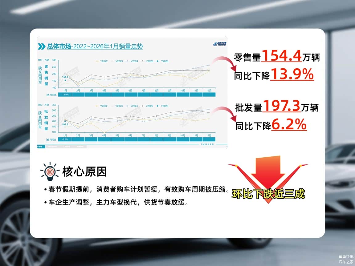 结合核心数据进一步拆解,1月狭义乘用车零售量154.4万辆,批发量197.3万辆,其中批发量同比下滑6.2%、环比下跌近三成,两大核心指标同步走低,核心原因主要有两点,均与消费者购车决策及车企生产节奏密切相关:一是春节假期提前,多数消费者暂缓购车计划,经销商促销节奏放缓,有效购车周期被压缩;二是年初车企进入常规生产调整阶段,部分主力车型处于换代周期,供货节奏放缓,间接影响零售销量表现。