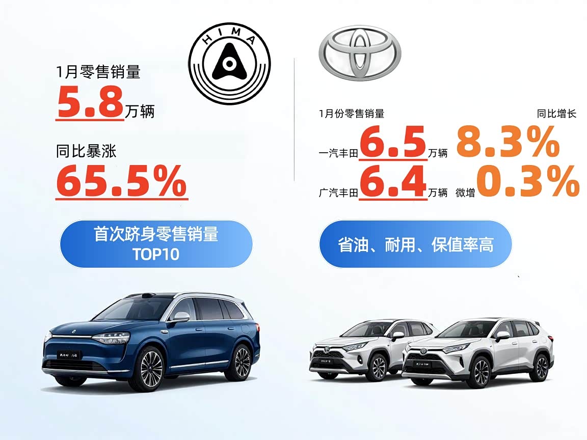 除头部三强外,1月车市还有两大亮点值得关注,对新能源车型潜在消费者具有重要参考价值。其一为鸿蒙智行,当月零售量达5.8万辆,同比暴涨65.5%,首次跻身零售销量TOP10,成为1月车市核心增长亮点。其旗下问界M9、M8等车型,依托华为智能座舱与鸿蒙生态的技术优势,精准切入高端新能源市场,打破传统车企在该领域的垄断格局,印证了“智能+生态”的行业发展趋势。其二为南北丰田,在多数车企销量下滑的背景下,一汽丰田同比增长8.3%、广汽丰田微增0.3%,成为TOP10中为数不多实现销量增长的车企。卡罗拉、RAV4荣放、凯美瑞等主力车型,凭借省油、耐用、保值率高的核心优势,持续获得家庭用户认可,市场口碑效应持续释放。