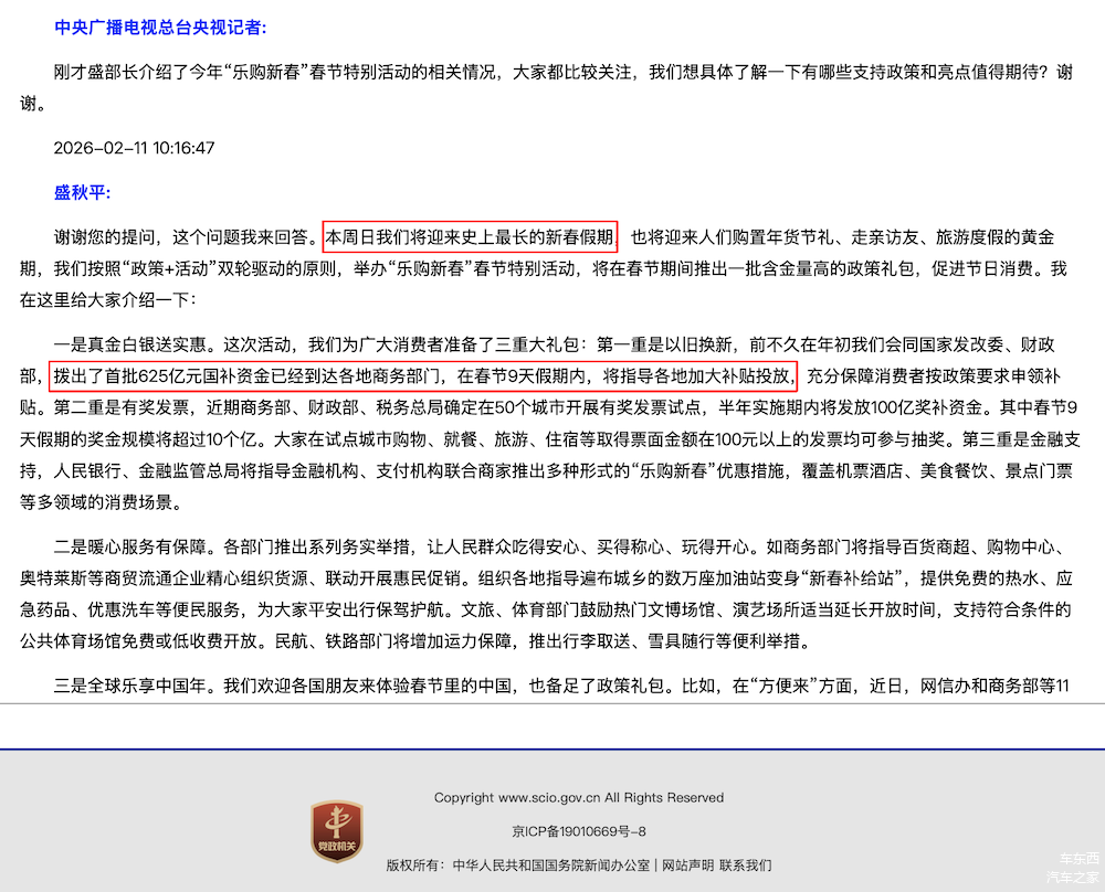 史上最长的新春假期即将来临,首批625亿国补资金的下达,有望帮助消费者降低购车门槛,既刺激了市场消费欲望,又进一步保障汽车产业平稳运行。