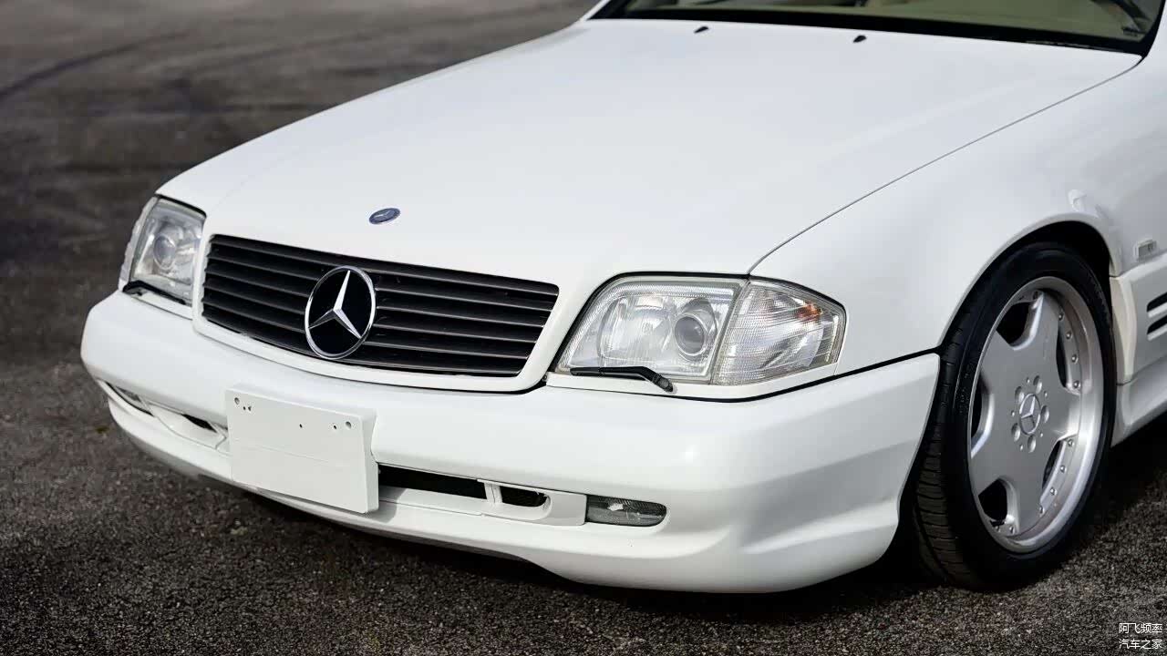 外观上,它依旧保持着当年的优雅与霸气。极地白(149)漆面光亮如新,搭配AMG专属空力套件,线条流畅而不失攻击性。最具价值、也最稀有的配置,是它配备了同色全景天窗硬顶。这项配置在当年选装价极高,产量极少,不仅让车顶线条更流畅、视野更通透,也让这台SL在硬顶模式下拥有媲美双门GT跑车的静谧性与刚性,是R129世代最顶级、最梦幻的配置之一。