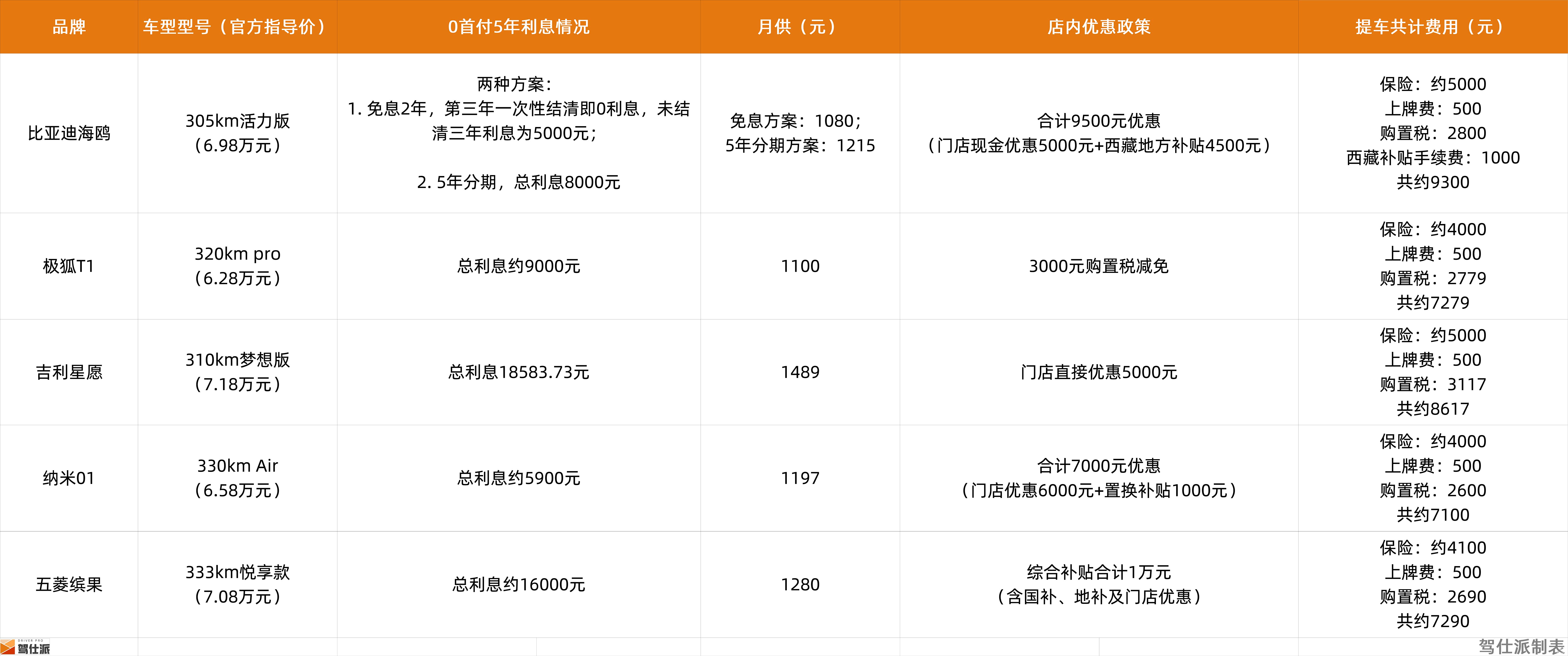 为了更直观的呈现各款车型的优惠政策以及利息和提车费用,我们把本次探访的车型的实际数据以更加直观的表格呈现如下: