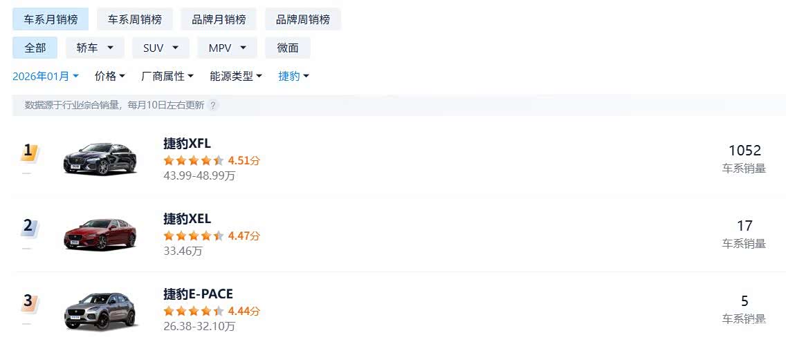 2026年1月汽车销量排行榜公布了,表现最好的变成了小米YU7,它卖出了37869台,第二名是吉利博越L,它卖出了34176台,这两款车是唯二的单月销量突破3万台的车型,第三名是吉利星愿,它卖出了29007台,前15名中都没看见比亚迪的“踪影”。用一个词来形容一月份汽车销量排行榜,我只能想到“震荡”。有销量表现好的,就有销量表现不好的,其中,有一款豪华价格已经跌至低点,但一个月只卖出了17台,可以说“老惨了”,这款车就是捷豹XEL。