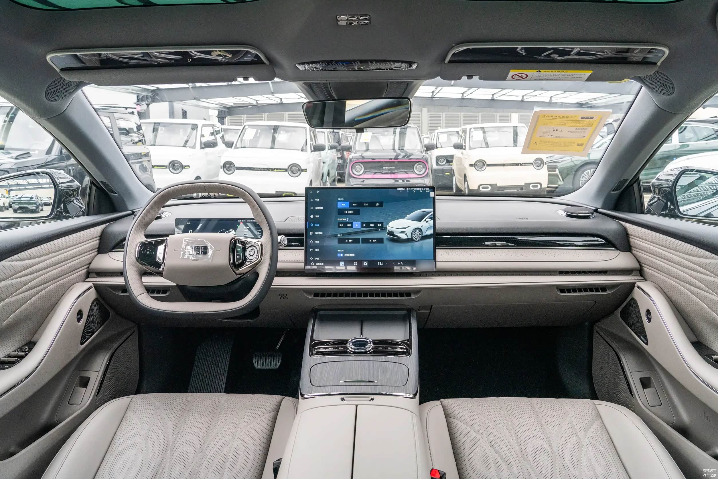 内饰方面,虽然是标配车型,但内饰看上去和高配车型也没有什么两样,配备了10.2英寸液晶仪表盘和15.4英寸悬浮式中控屏幕,支持360度全景影像、180度透明底盘、高德地图、全速自适应巡航、双区域语音识别控制、手势控制、DeepSeek大模型、4G车联网、手机控车和OTA升级等,功能够用。不过前排地台上的面板并非手机无线充电,只能放手机。