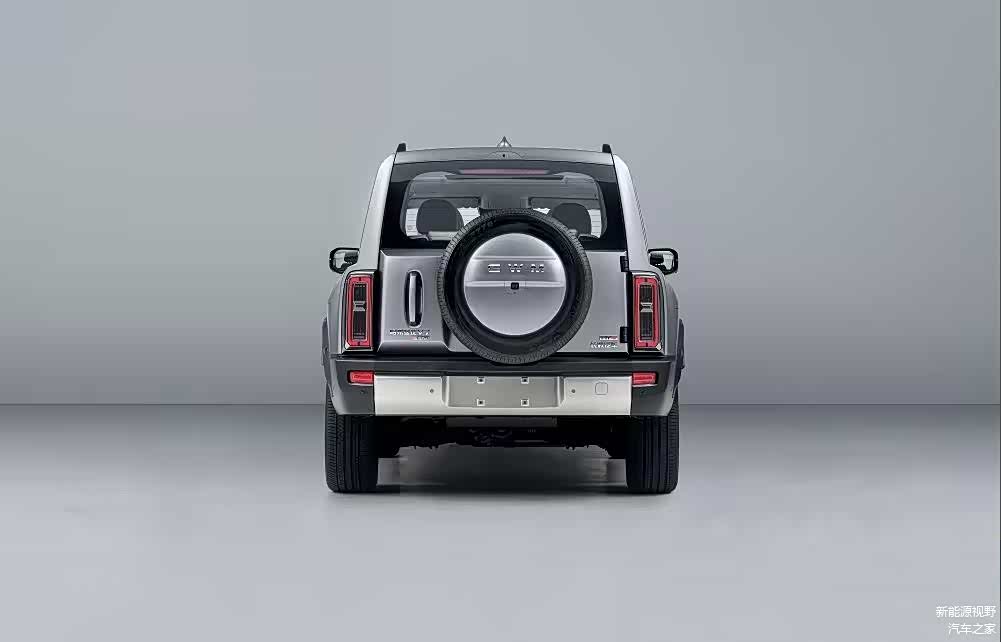 车身和尾部沿用现款车型设计,方盒子车身设计、宽大方正的轮眉,超高的离地间隙,搭配超大尺寸双5辐铝合金轮毂,凸显出硬派SUV的专属特性。尾部,两侧依然采用纵向设计的长方形尾灯,造型更加硬朗。此外,外挂式备胎也继续配有。新车长宽高分别为4912(4792)/1950/1886(1905)mm,轴距为2850mm,相对现款常规款大了一圈。