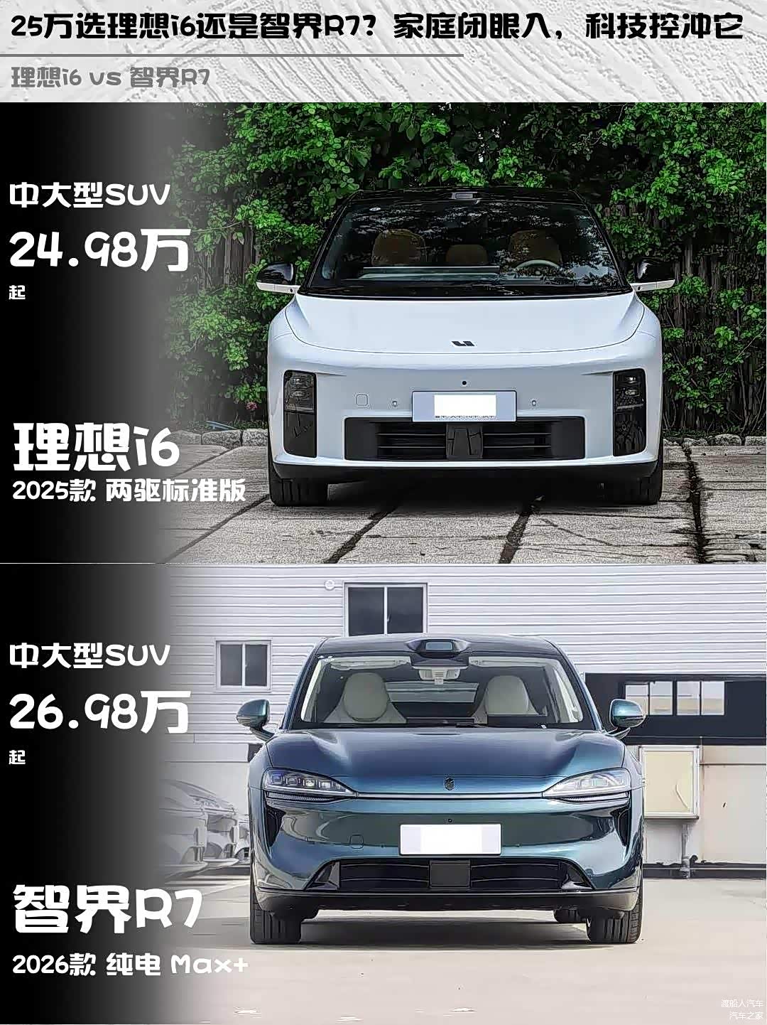 最近后台好多人在问 理想i6(图片 | 参数 | 询价)和智界R7怎么选,作为深度体验过两台车的车主,今天就从实际使用角度聊聊这两台25万级纯电SUV的差异点!🔍