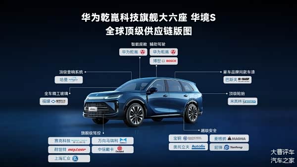 你以为华为全家桶就是华境S最大的亮点了吗?NO NO NO,它的供应商名单,堪称汽车界的“全明星梦之队”:博世负责提供感知世界的眼睛(高精度传感器),耐世特和马瑞利联手调教出顺滑又安稳的驾控感(转向系统+CDC减震器),脚下踩的是米其林的高性能轮胎。安全方面更是武装到牙齿,车身骨骼用的是宝钢的高强度热成型钢,气囊来自奥托立夫,连玻璃都是福耀的。甚至就连你听到的音响(哈曼旗下Infinity)、摸到的内饰、甚至车漆的质感(巴斯夫定制),那都是个顶个的行业顶尖标准。