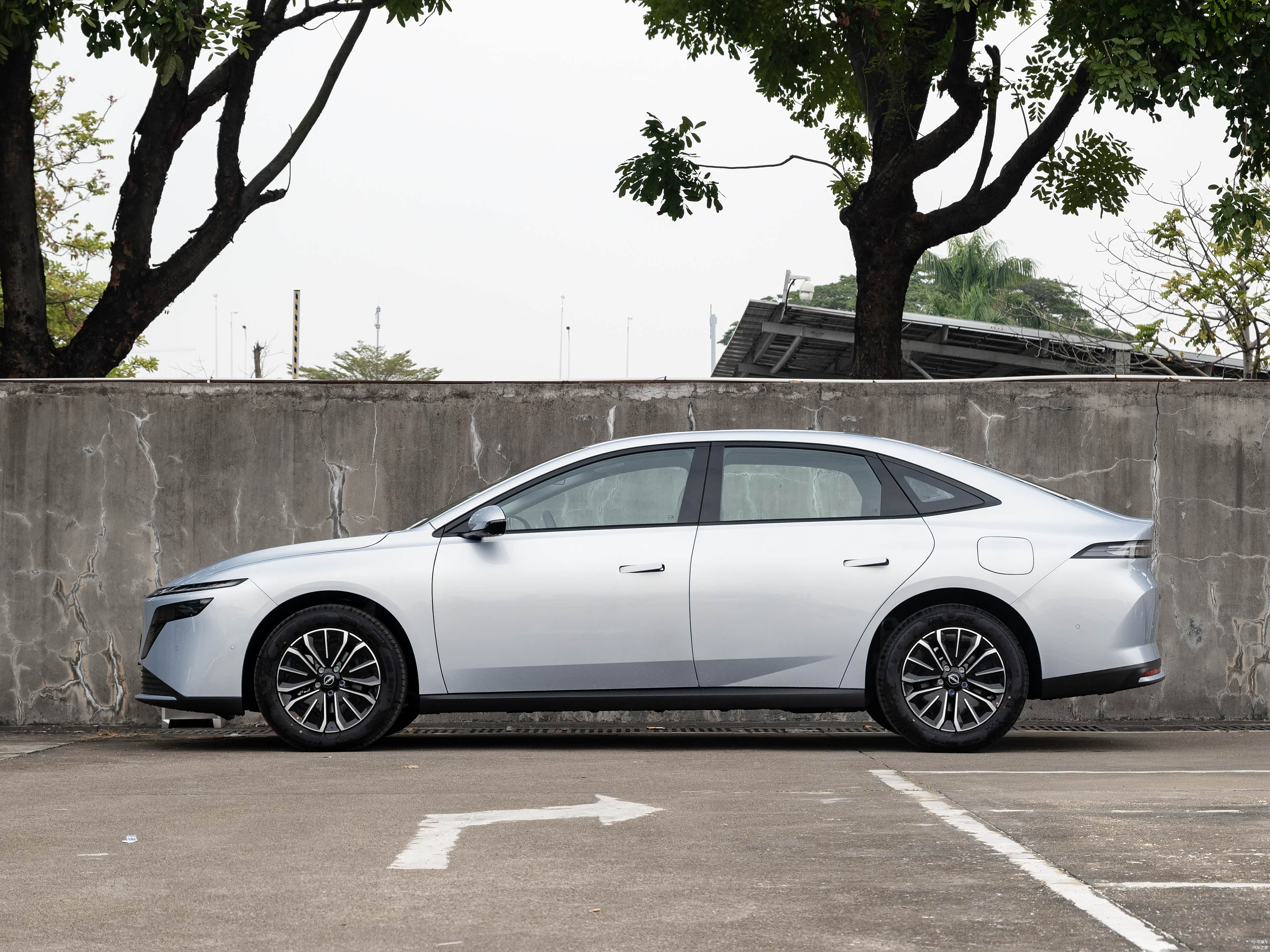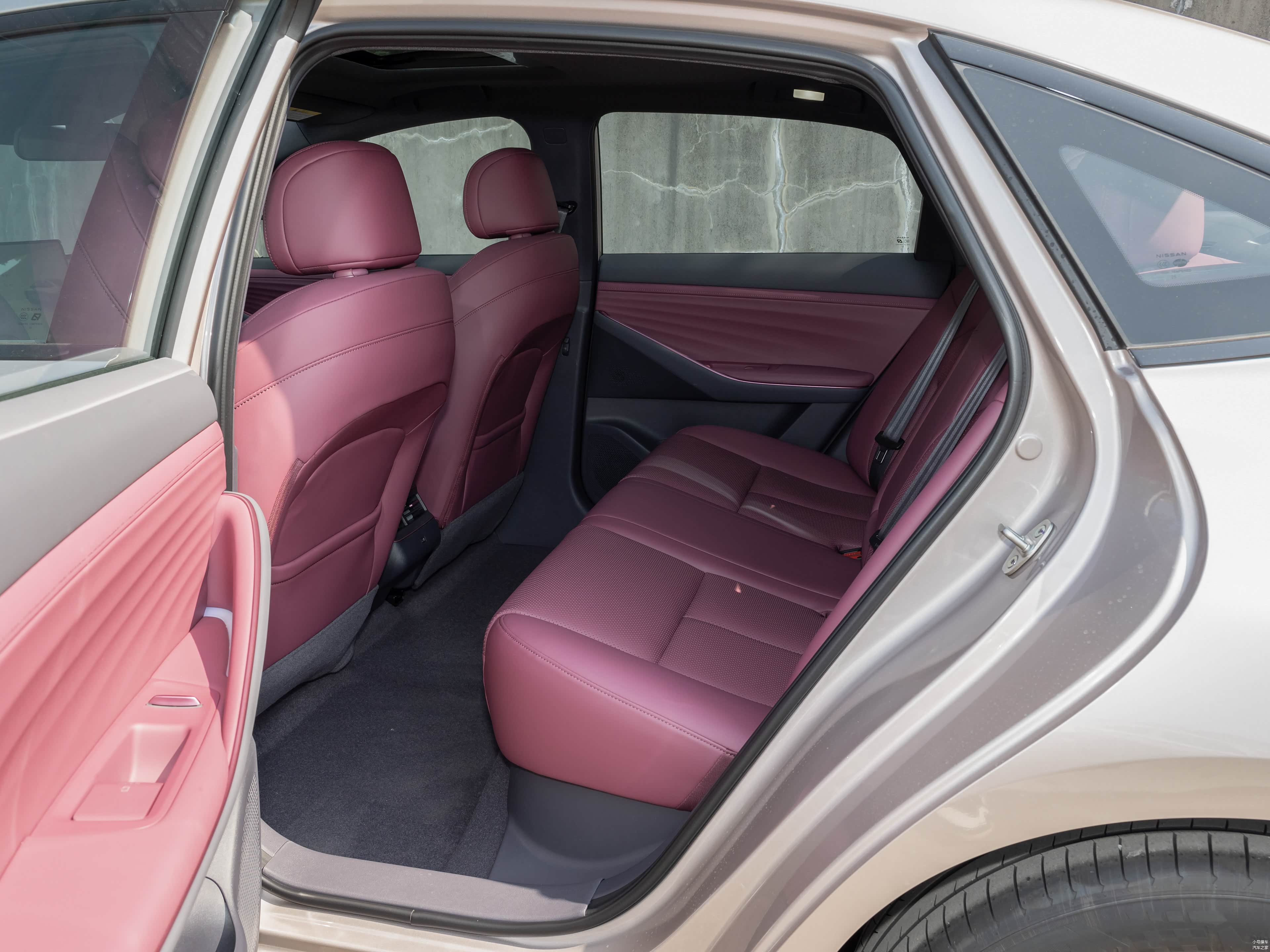 侧面造型方面,车顶带着点溜背式线条,风格比较圆润,腰线采用了分段式设计,点缀出了车身侧面的层次感;门把手则是弹出式设计,能够起到降低风阻的作用;轮眉和侧裙部分设计有隆起的筋线,有着比较强的肌肉感;轮毂则是 低风阻多幅式造型,风格比较简洁。