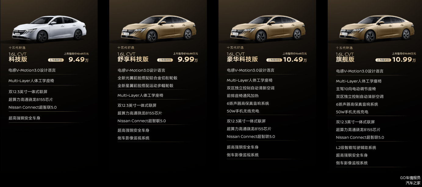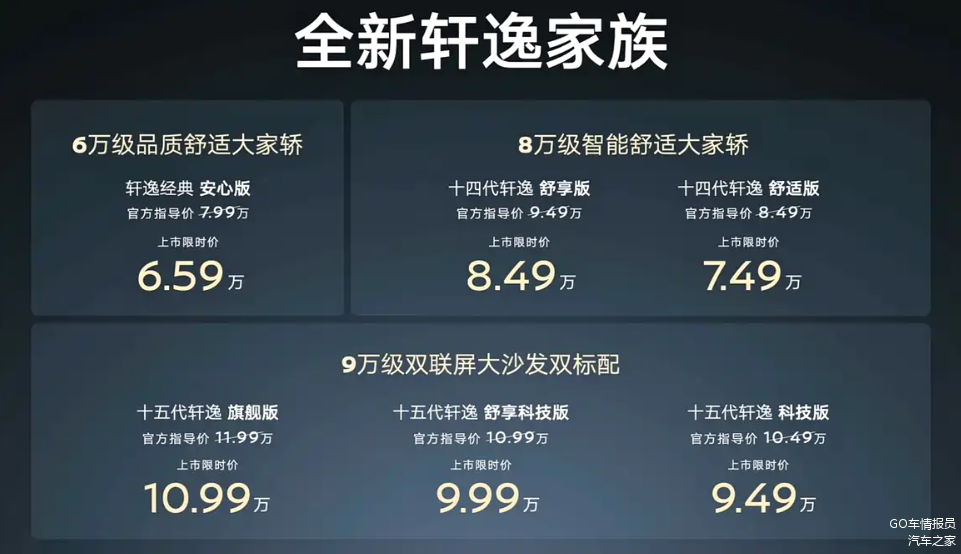 除了最新一代的轩逸,经典轩逸和第十四代轩逸也同期上市,构成了目前行业比较少见的“三代同堂”销售的局面。其中轩逸经典官方售价7.99万元,上市限时价6.59万元,第十四代轩逸官方售价8.49-9.49万元,上市限时价7.49-8.49万元。