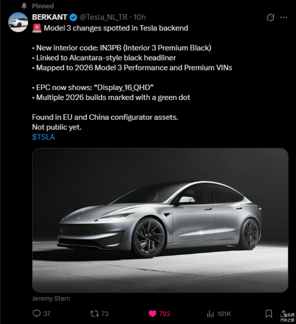 海外汽车软件工程师@BERKANT爆料称,他通过分析欧洲和中国官网的资源及后台代码,发现Model 3将有新配置。除了新增黑色车顶内衬选项外,还会加入一款16英寸QHD分辨率显示屏,这块屏幕与Model Y高性能版所用的型号相似。