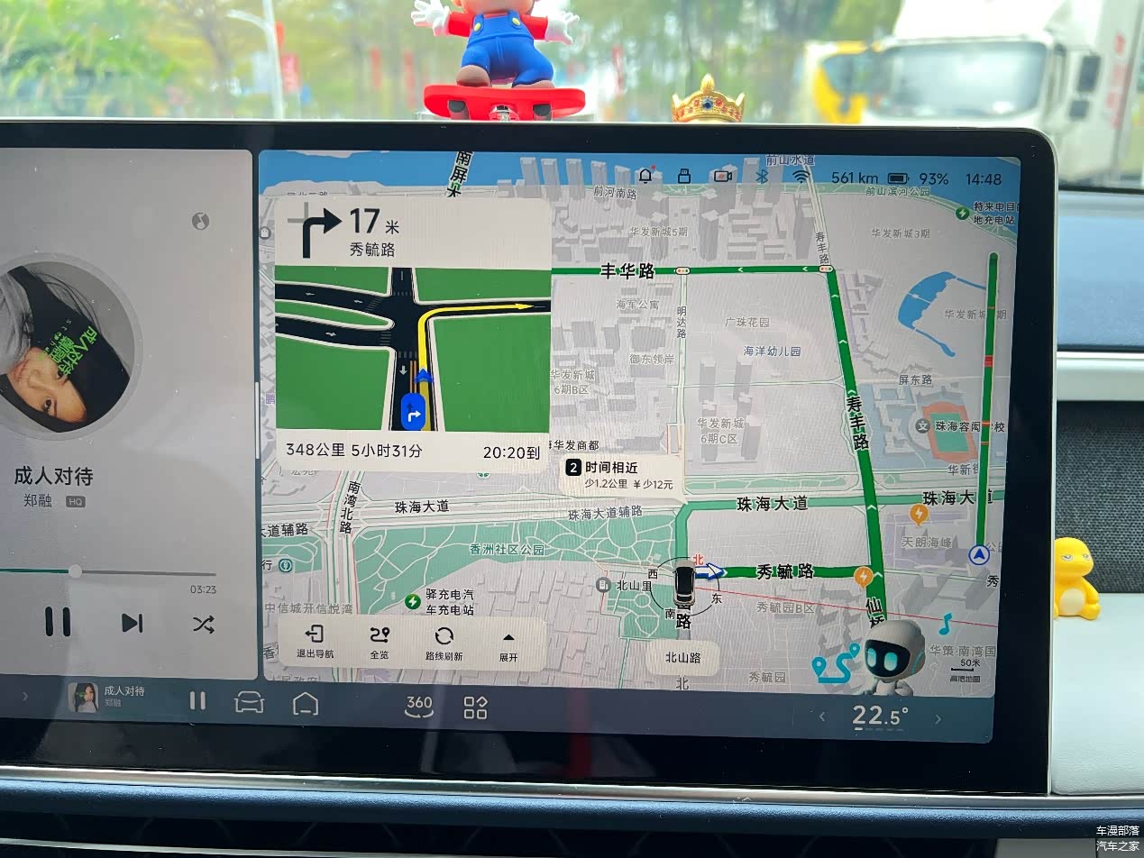 不过好景不长,导航地图上那熟悉的红色出现了。前后堵了2次,拥堵时间加起来1个半小时左右。要是油车堵在这儿,听着发动机怠速,心都在滴血。但电车就不一样了,堵车除了脚累点,能耗几乎可以忽略不计。