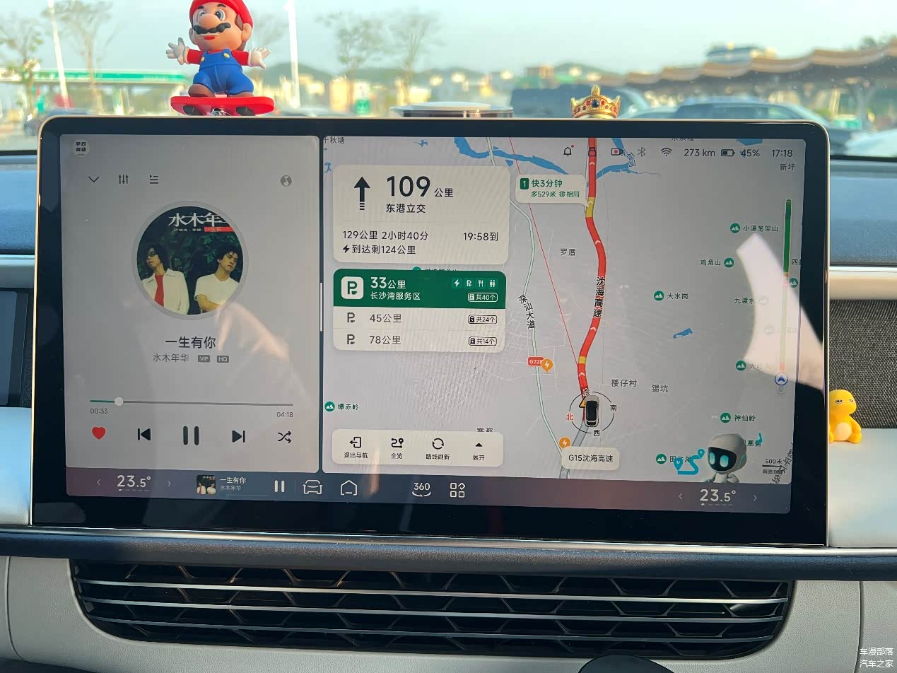 趁堵车,拐进了服务区,此时表显续航还剩273公里,而车辆总里程已经来到了99672km。简单算一下,这一段实际跑了99672 - 99454 = 218公里,而表显续航掉了560 - 273 = 287公里。这一段高速为主的续航达成率大概是218 ÷ 287 ≈ 76%,这个高速表现我觉得完全在接受范围内。