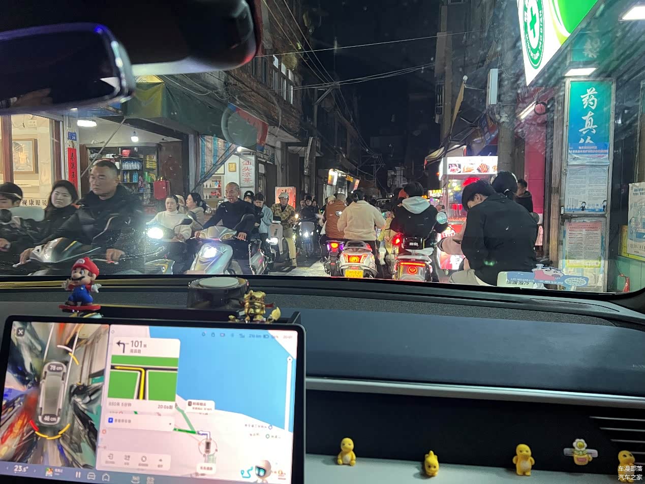 后半段路况变得复杂起来。下高速进了村里,经过了一段拥挤小巷子,前后是连绵不断的摩托大军。很考验车技,但对续航影响不大。