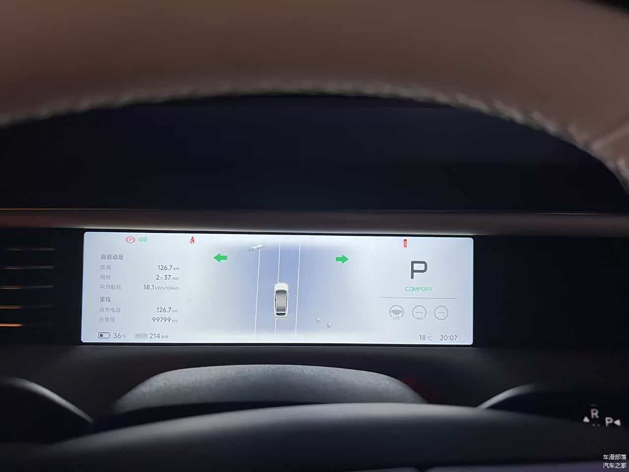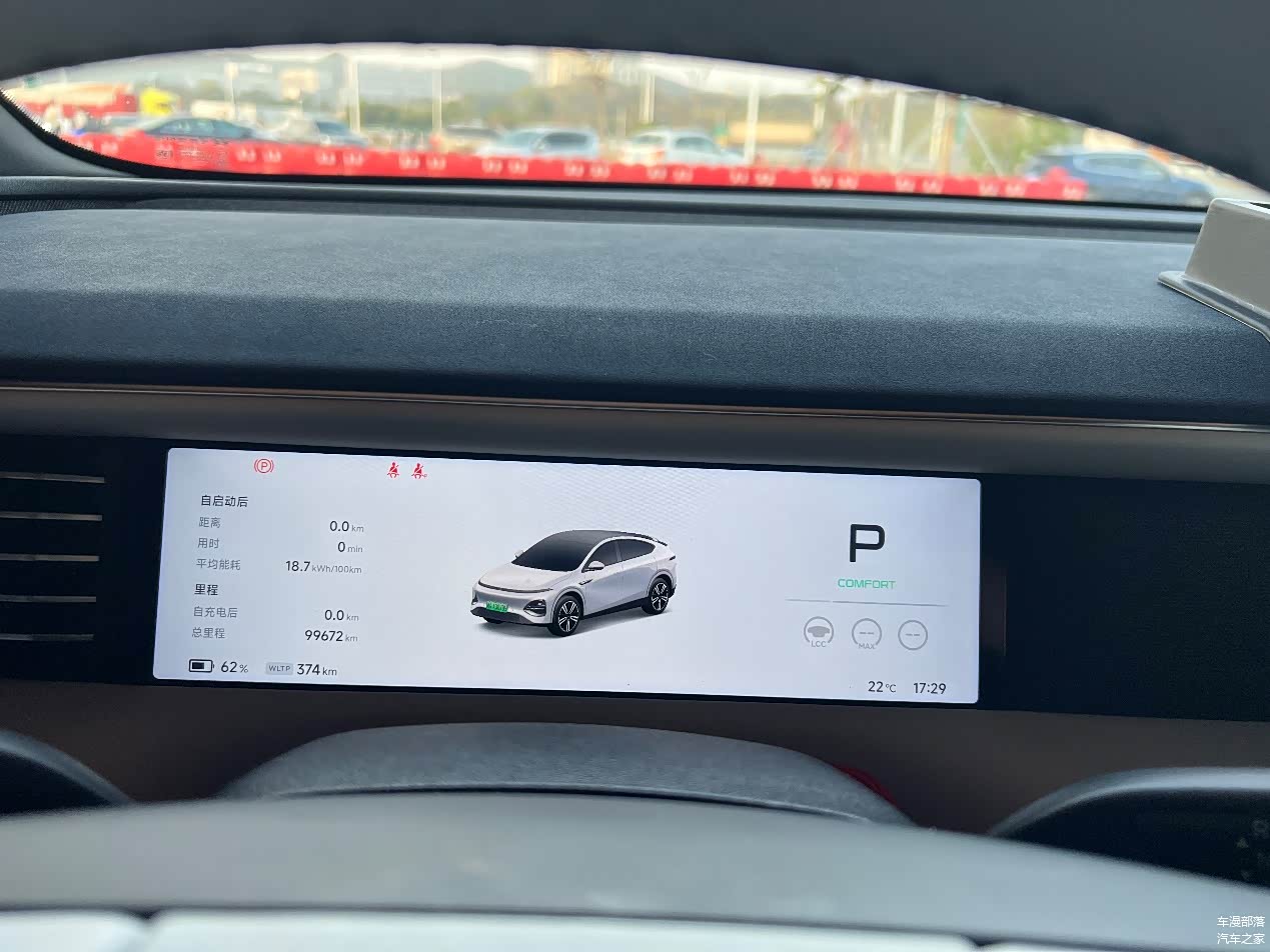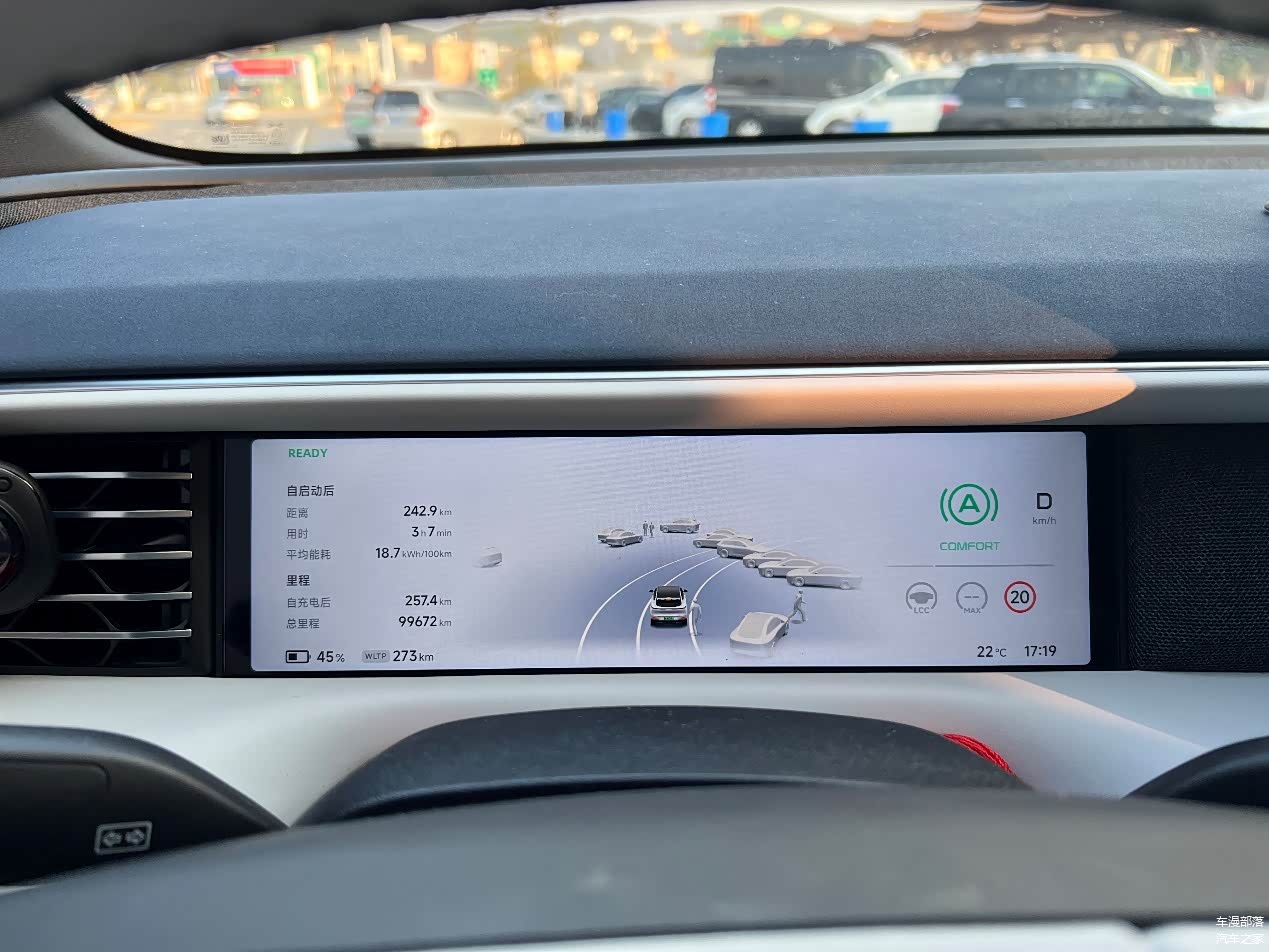 出发前,WLTP续航560公里,车辆总里程99454km。车上一共4个大人,后备箱也是满满的。而且当天温度22度,对电车来说是最友好了。