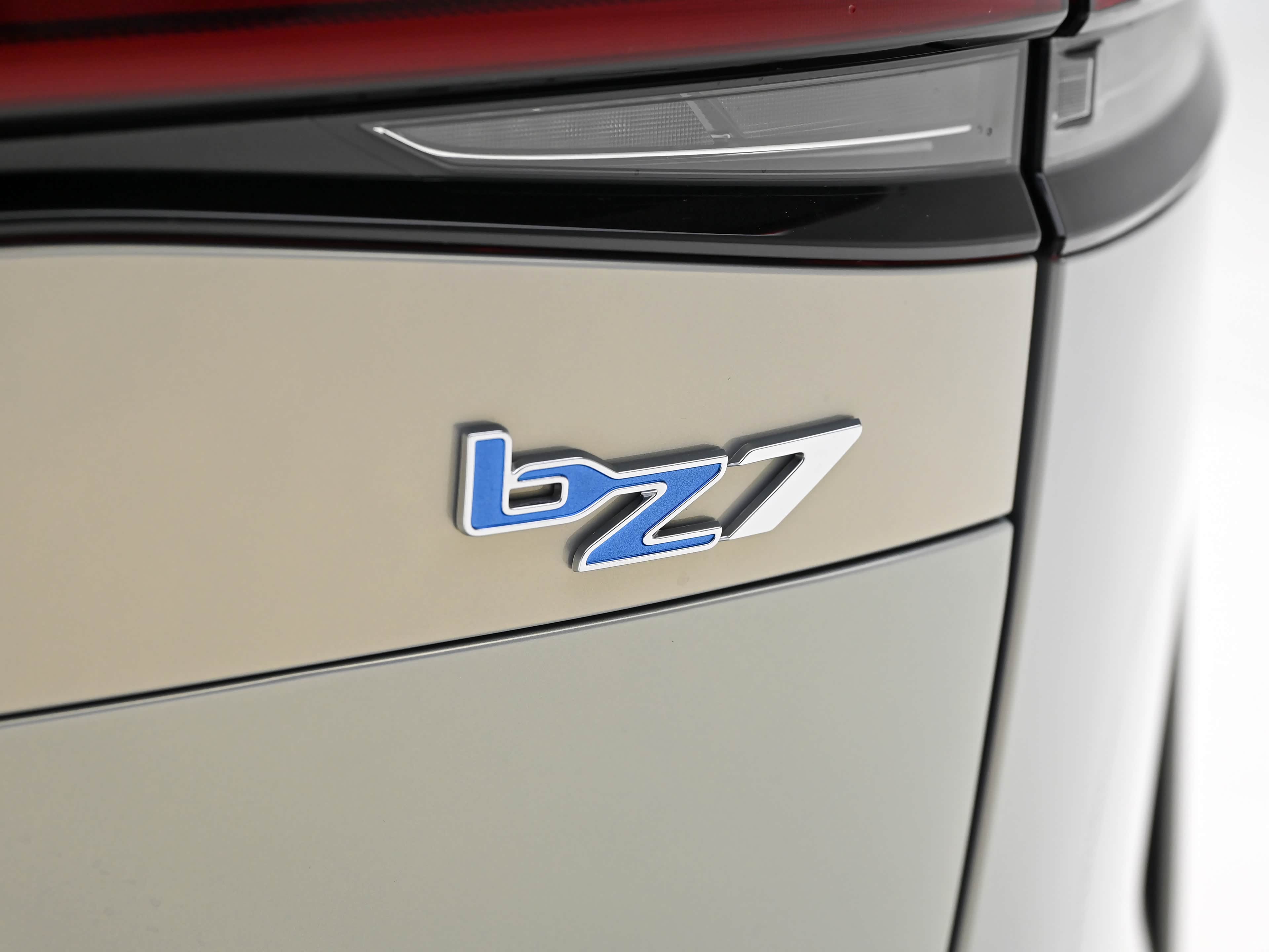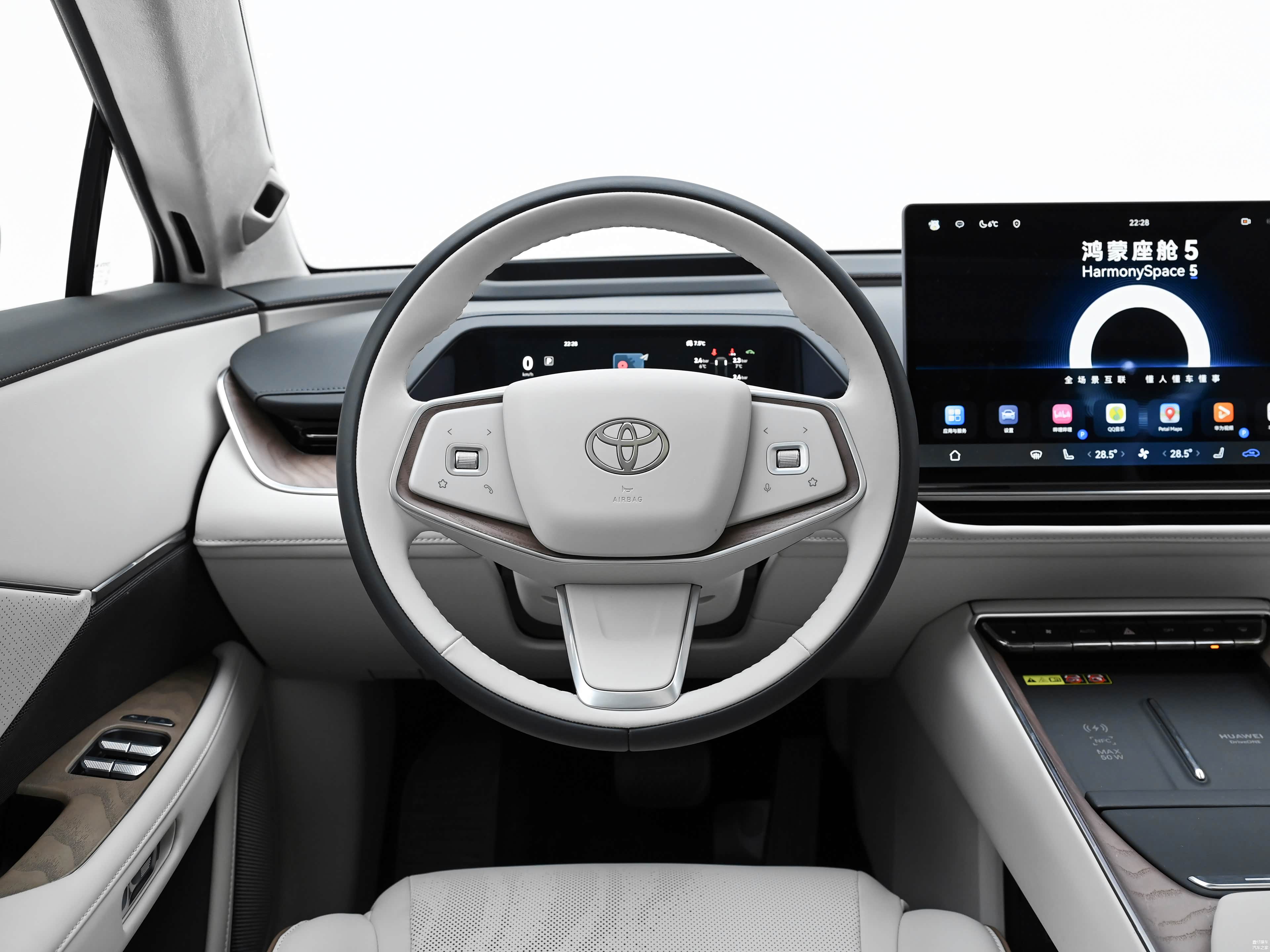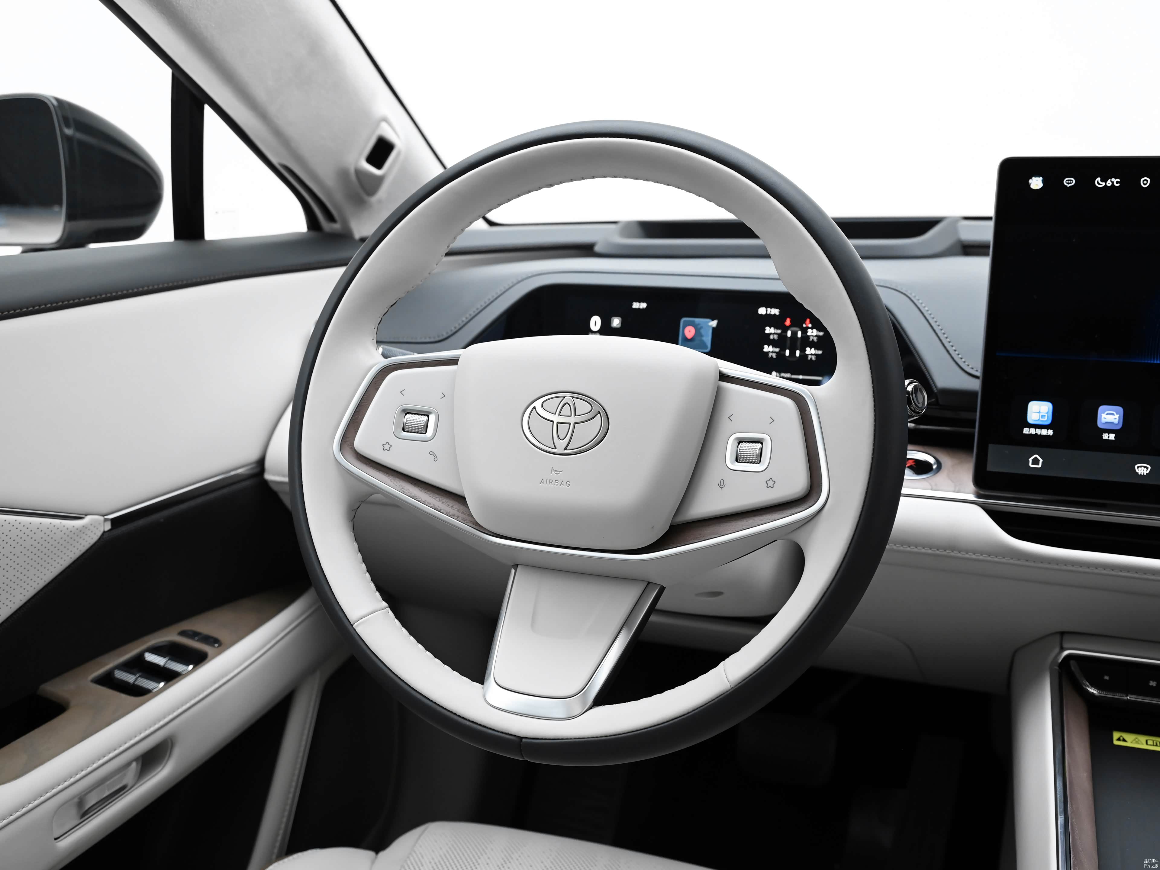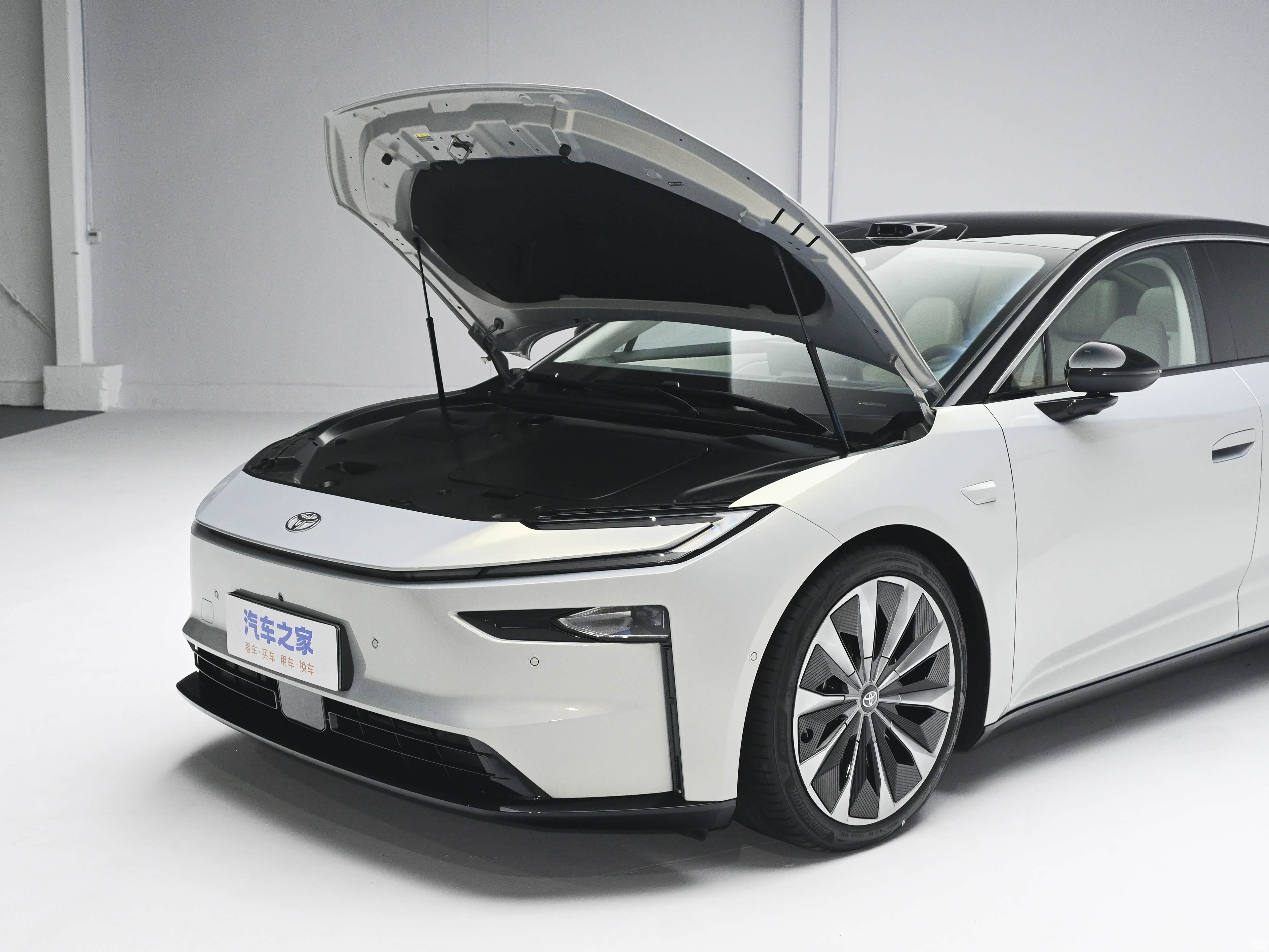 外观层面,铂智7采用丰田品牌电动化设计语言。车头为封闭式前脸结构,下方保留梯形散热开口以满足电驱系统热管理需求。贯穿式LED日间行车灯形成半包围视觉形态,灯带在两侧与远近光灯组衔接,形成横向展开的灯光布局,增强前脸宽度观感。