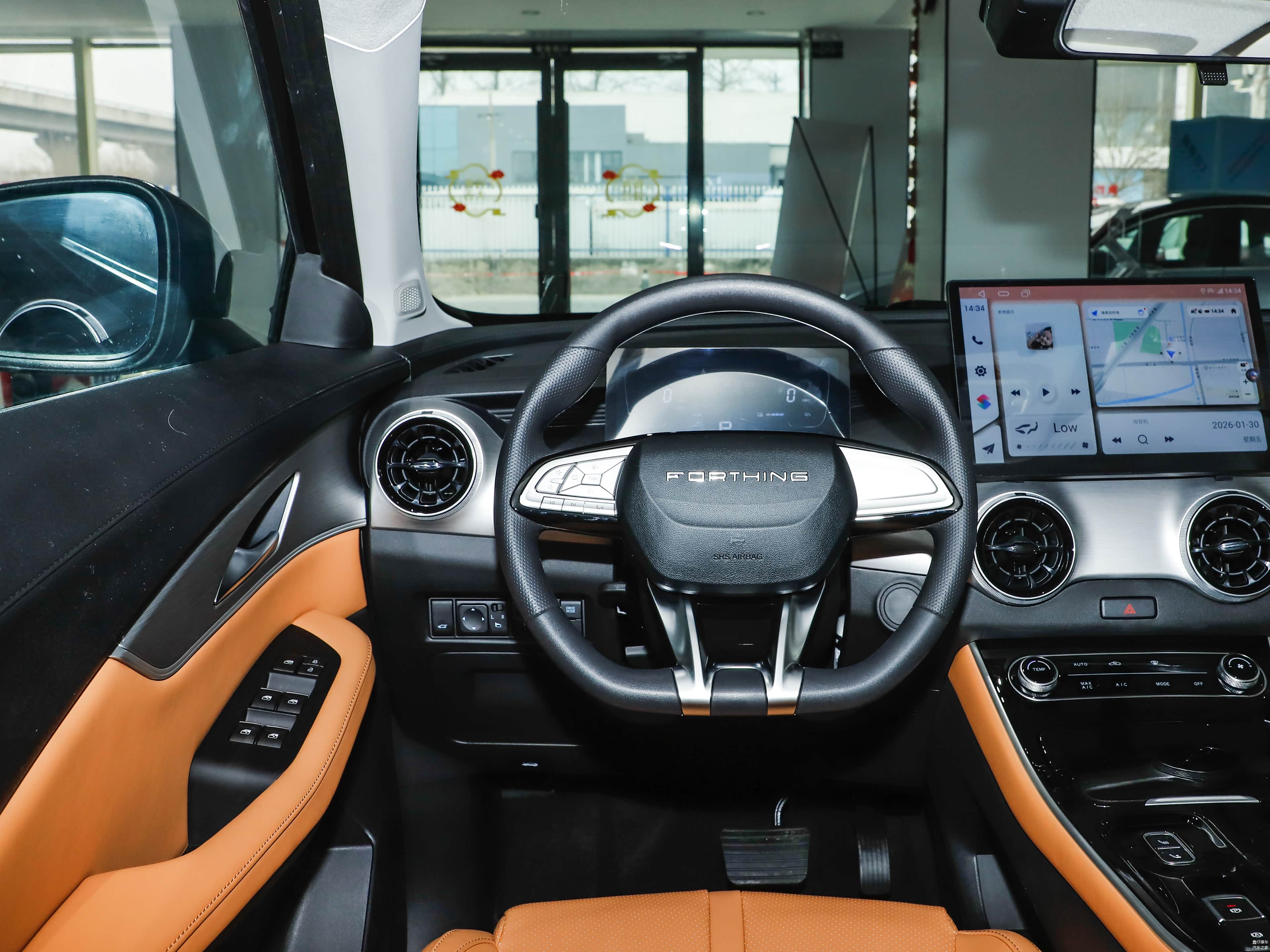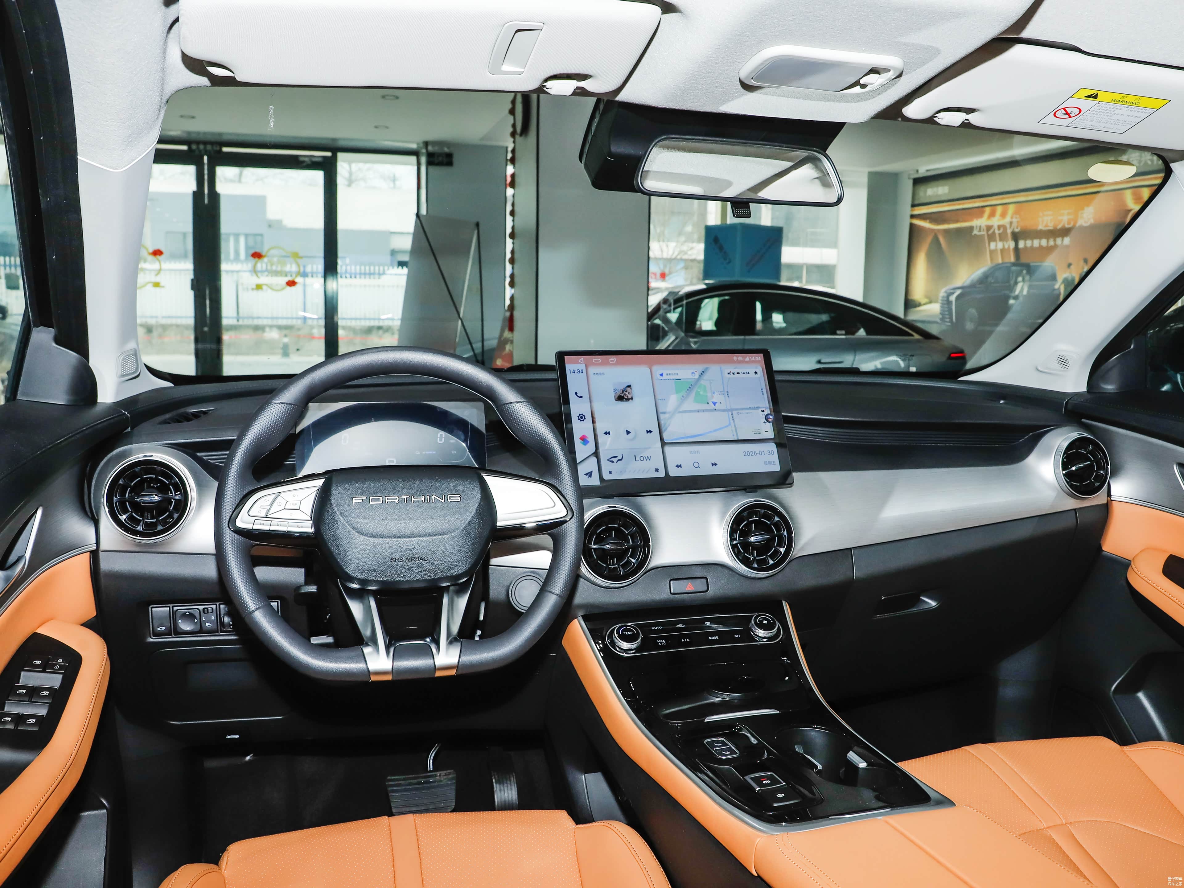 中控台采用阶梯式结构分层布局,功能区域分区清晰。银色饰板作为局部点缀,用于区分操作区域。两侧与中央设置圆形空调出风口,在视觉上形成对称结构。从人机工程角度来看,悬浮式中控屏位置较高,有利于驾驶时视线平移操作。实体方向盘按键则用于常用功能控制,减少行驶中分心操作。