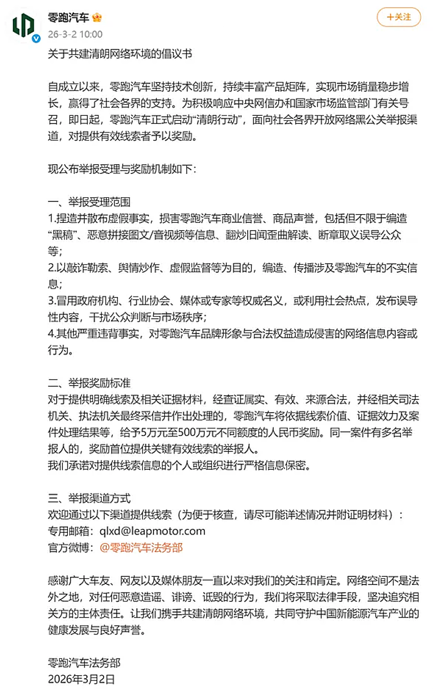 3月2日,零跑汽车品牌账号发布《关于共建清朗网络环境倡议书》。