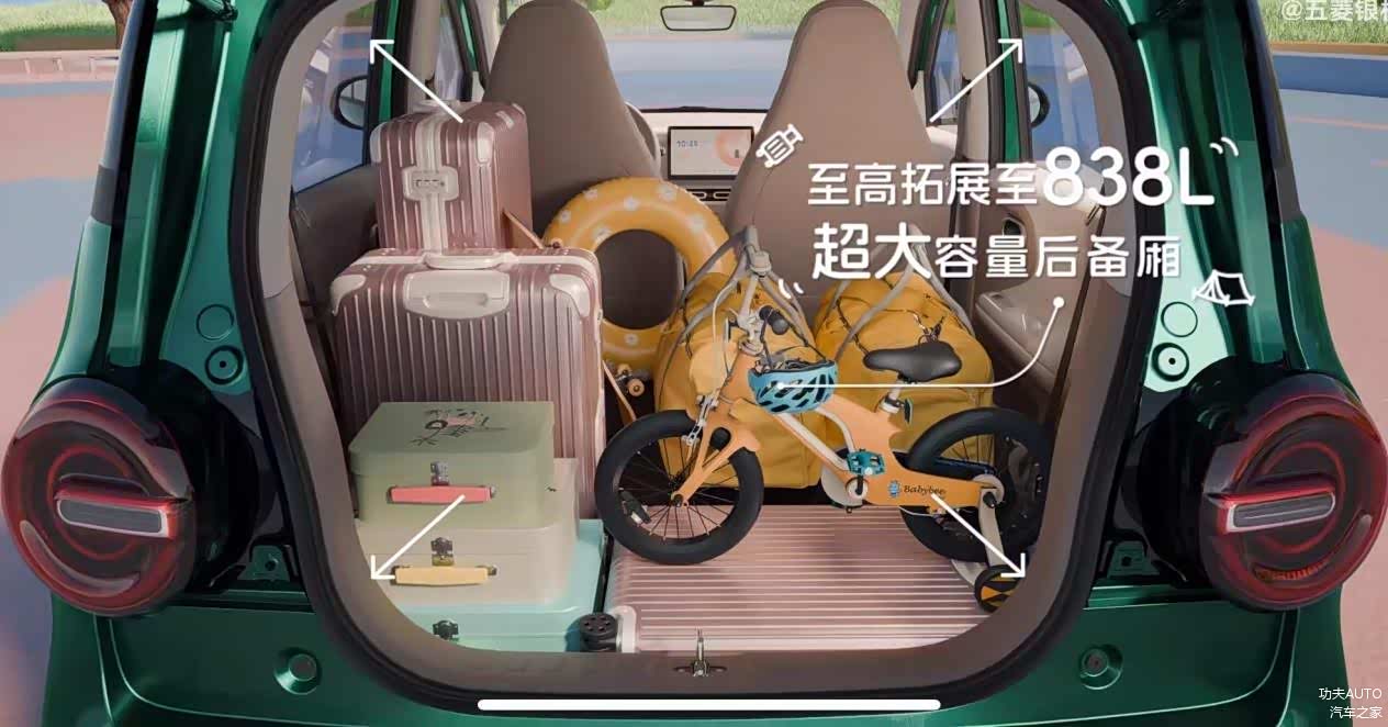 车身尺寸方面,双门版:3043×1520×1590mm,轴距1965mm;四门版:3268×1520×1575mm,轴距2190mm,后备箱容积可达838L,空间规划合理,兼顾乘坐与储物实用性。