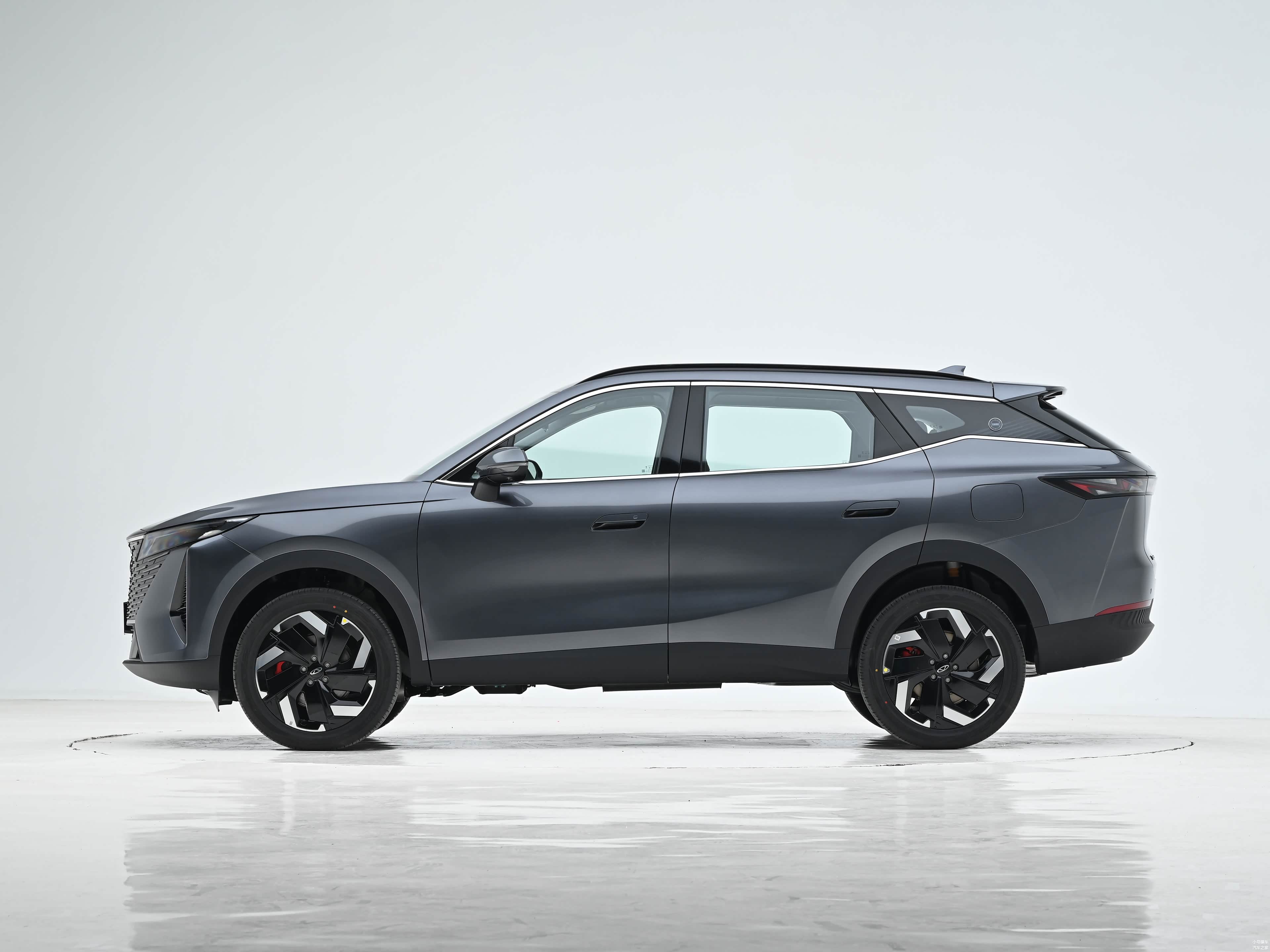 侧面造型方面,车顶带着明显的弧度,配备有行李架,而且还营造出了悬浮式车顶,属于目前非常流行的设计语言;腰线采用了分段式设计,点缀出了车身侧面的层次感;轮眉和侧裙部分设计有粗壮的黑色饰板,进一步增强了力量感;轮毂采用了五幅式刀锋造型,有着一定的运动气息。