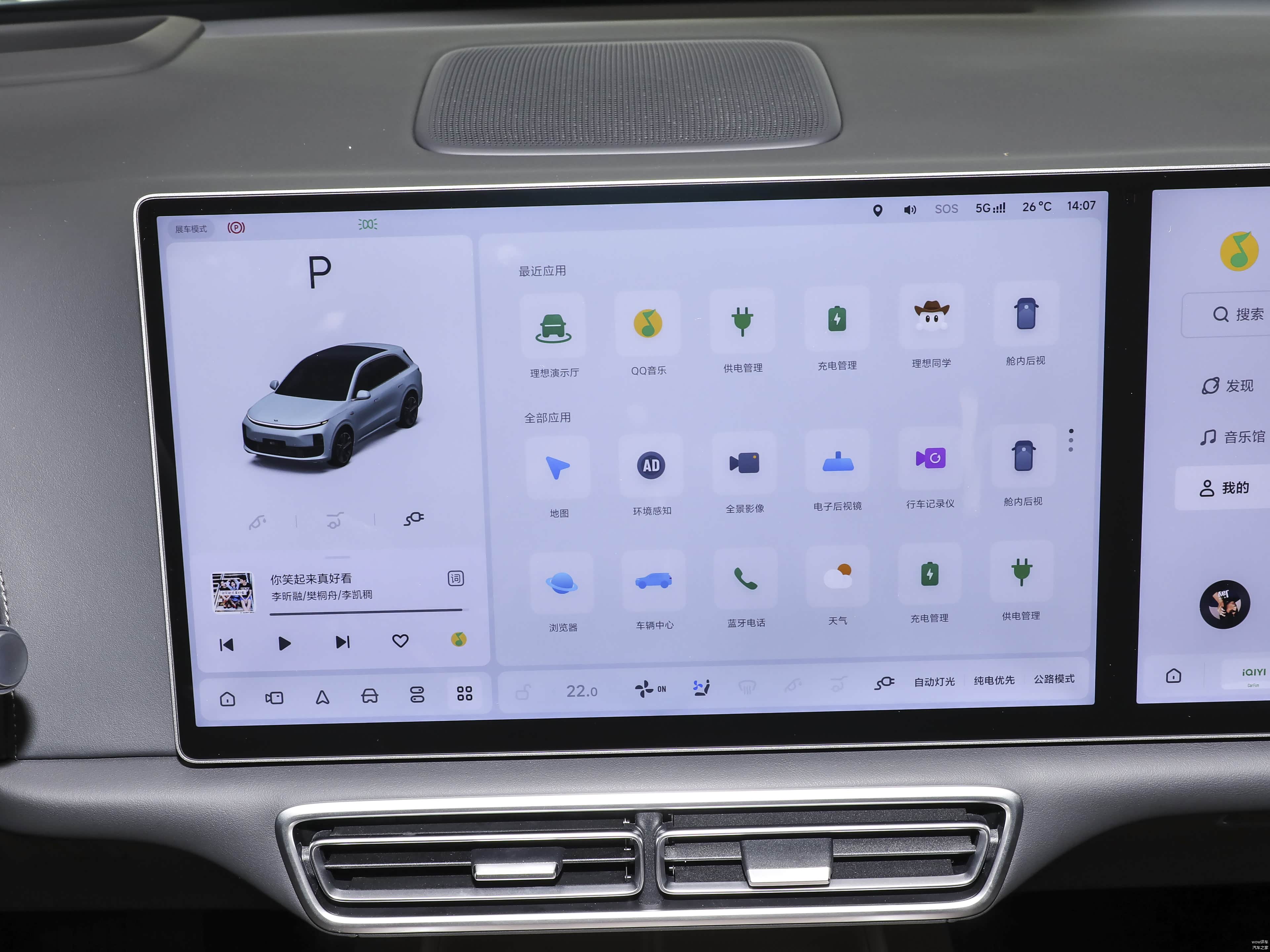 内饰延续理想经典的简约布局,无过多复杂按键,中控屏与副驾屏的分区设计清晰,即使是新手也能快速上手,属于“耐看、好用”的家用设计风格,唯一不足是家族化设计新鲜感稍弱。