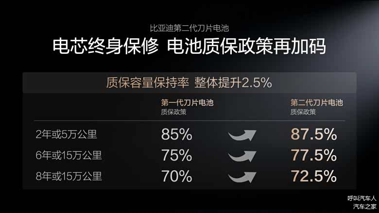 第二代刀片电池通过打造“锂离子高速通道”和“全温域智能热管理系统”,实现了更低的产热和更高效、均匀的散热,让闪充对电池寿命几乎没有影响。基于这样的底气,比亚迪还宣布电池质保政策再加码!第二代刀片电池质保的“容量保持率”整体提升2.5%,电芯依旧是“终身保修”,这就是第二代刀片电池,给所有用户的安心承诺。