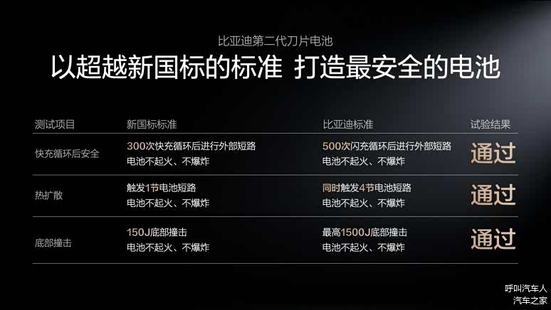 第二代刀片电池继续将安全进行到底,通过一系列超越新国标的安全测试,为用户打造最安全的电池,确保电池全生命周期都安全,彻底打消用户的安全顾虑。