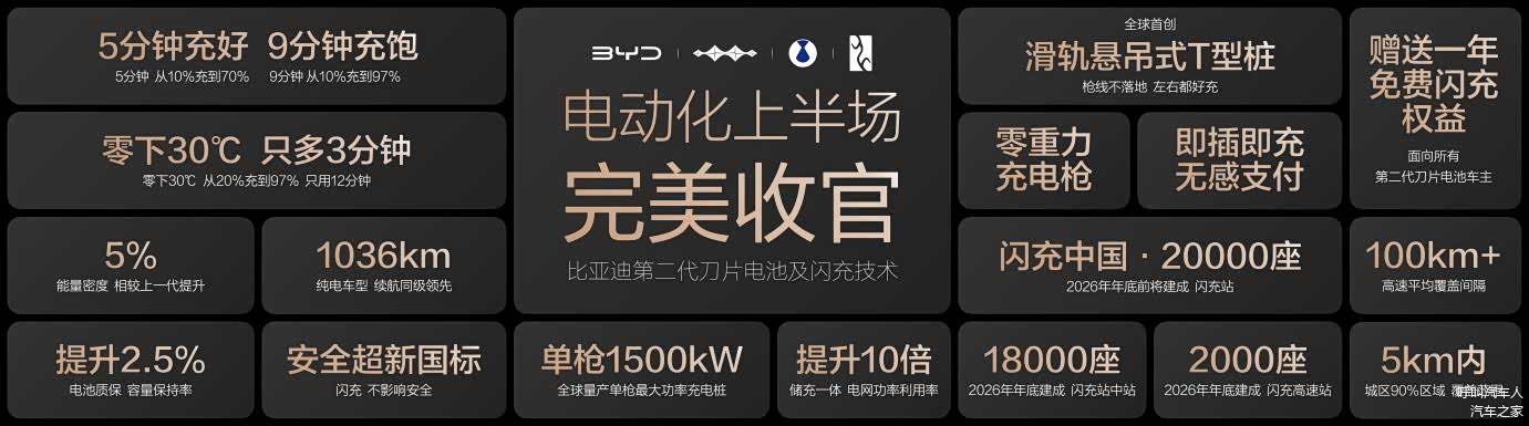 2026年3月5日,比亚迪在深圳大运中心体育馆召开“闪充中国 改变世界”发布会。正式发布:第二代刀片电池及闪充技术,创造全球量产最快充电速度新纪录,从10%到70%,只用5分钟就能充好;从10%到97%,只用9分钟就能充饱;零下30度,从20%到97%,只比常温多3分钟。一举攻克了电动化上半场“充电慢”和“低温充电难”的世界性难题,电动化上半场至此完美收官。同时,发布“闪充中国”战略,年底将在全国建设20000座闪充站,让用户充电更自由、更便捷,从此新能源汽车充电迈入闪充时代。