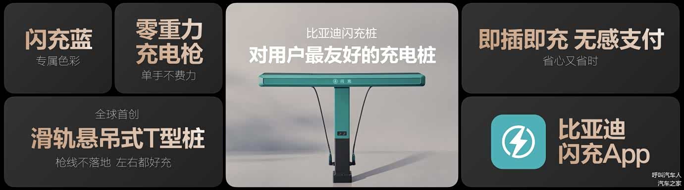 传统公共充电桩枪重、线脏、移动不灵活,充电流程还很繁琐,为了解决这些痛点,比亚迪闪充桩采用了全球首创的“滑轨悬吊式T型桩”设计,让线拉着枪,手感非常轻巧,几乎是“零重力充电枪”;并且,枪线永远保持悬空,避免缠绕更干净;还可以让用户轻松左右滑动,充电更灵活。同时,比亚迪还打通了车和桩之间的所有链路,只需通过比亚迪闪充APP简单设置,即可实现“即插即充,无感支付”,这就是对用户最友好的充电桩。