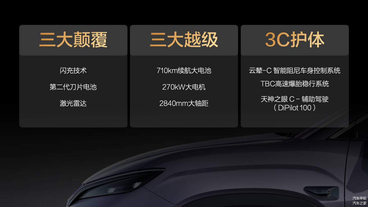除了“第二代刀片电池、闪充技术及激光雷达”带来的三大颠覆,宋Ultra EV还带来了“三大越级、3C 护体”。宋Ultra EV的电机最大功率为270kW,为多种场景尤其是高速行驶带来了充沛的动力,其最高时速可达210km/h。