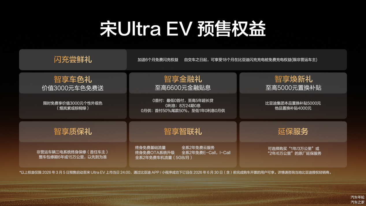 2026年3月5日,比亚迪王朝B级闪充SUV 宋Ultra EV正式开启预售,全系搭载比亚迪第二代刀片电池及闪充技术,同时配备多项奢适配置。新车预售价15.5-18.5万元。同时,预订用户还将享受整整18个月免费闪充权益。