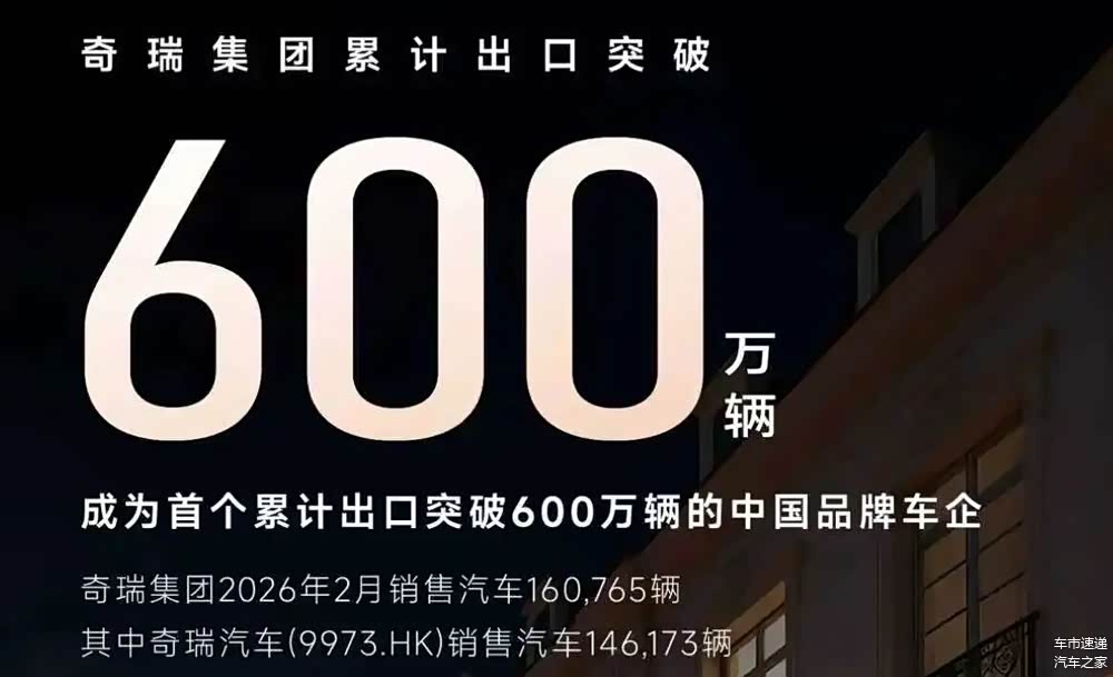 根据奇瑞集团公开的产销快报显示,集团2月销量160765台,今年前两个月累计销量超过38万台,其中,奇瑞汽车2月销量146173台。目前,奇瑞集团累计出口已突破600万台,成为首个累计出口超过600万台的中国品牌车企。