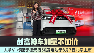 创富神车加量不加价 大拿V1标配宁德天行50度电池于3.7日北京上市