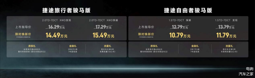 捷途自由者骏马版共推出2个版型,官方指导价12.79万元-13.79万元,限时焕新价10.79万元-11.79万元。