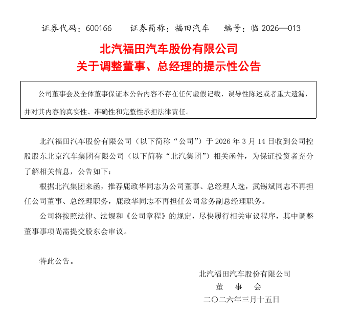 猫头鹰车志(ID:owlauto)讯,北汽福田汽车股份有限公司(下称“福田汽车”)3月15日发布人事调整公告,福田汽车迎来核心管理层重磅更迭,鹿政华获控股股东北汽集团正式推荐,拟任董事、总经理一职,原总经理武锡斌同步卸任董事、总经理职务,鹿政华也不再担任常务副总经理职务。