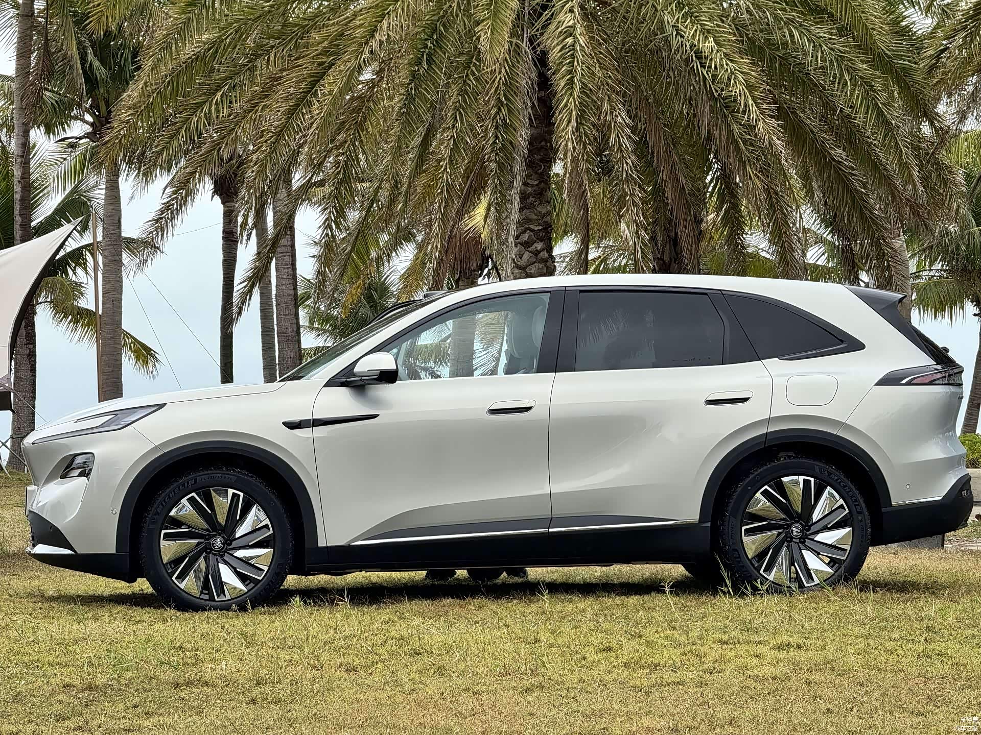 车身侧面,溜背造型线条流畅,镀铬饰条和20英寸亮面多幅轮毂营造出豪华氛围,半隐藏式门把手简洁又实用。车尾的贯穿式“银河展翼”尾灯、熏黑扩散器和大尺寸尾翼,运动感满满。车身颜色有四种选择,能满足不同审美需求。而且它的尺寸比自家热门燃油车还大,在同级别车型中也占优势。