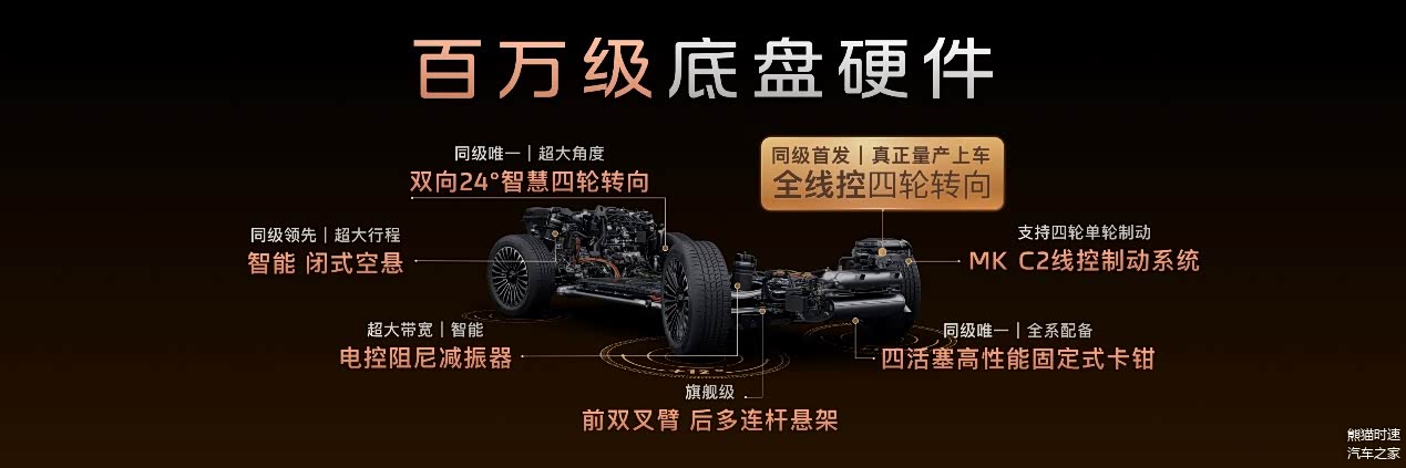 智己在全系车型上会有灵蜥数字底盘搭载,LS8当然也不例外,并且还用上3.0版本,也是一个显著的亮点之一,虽说现在越来越多车型开始使用线控转向+底盘一体化+后轮转向这样的技术,但从起步到成熟目前来看智己的经验和实际运用都是最多的品牌之一,就拿后轮转向来说双向24度角度大,这个角度越大车辆的用料要更扎实、电机功率要有保证,最终重要是轮控逻辑这套完整的研发,对工程师有很高的要求;试想5米多的中大型SUV有4.85米的转弯半径,跟MINI一样的调头能力,还会担心停车、调头的难吗?