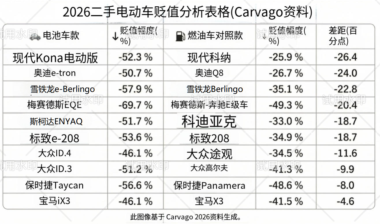 电动车的二手保值能力始终是行业内外争议的焦点,尽管特斯拉在该领域的表现似乎优于其他车企,但本次讨论暂不涉及这一品牌。据Carvago针对德国市场的最新分析结果显示,2022年至2025年这三年内,二手电动车的价格跌幅极为显著,且在保值表现上,全面落后于同级别燃油车型。