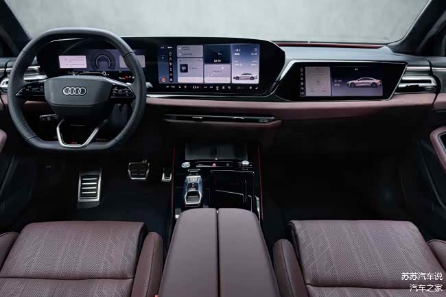 进入车内,科技豪华感扑面而来。11.9英寸领航视界、14.5英寸MMI全景中控屏、10.9英寸主动隐身副驾屏采用曲面OLED技术,打造以驾驶员为导向的数字舞台。配备30色氛围灯,遍布全车46处,使用行业领先的广色域光源。1.96平方米9分区智能全景天幕几乎覆盖了整个驾驶舱和后排。全景天窗两侧共设计112颗RGB LED,可实现30种颜色调节,与其它内饰氛围灯交互联动,可在欢迎、能量、律动、小憩4种模式中实现不同流水动画。配备16扬声器的Bang & Olufsen豪华音响系统,支持3D沉浸声场。